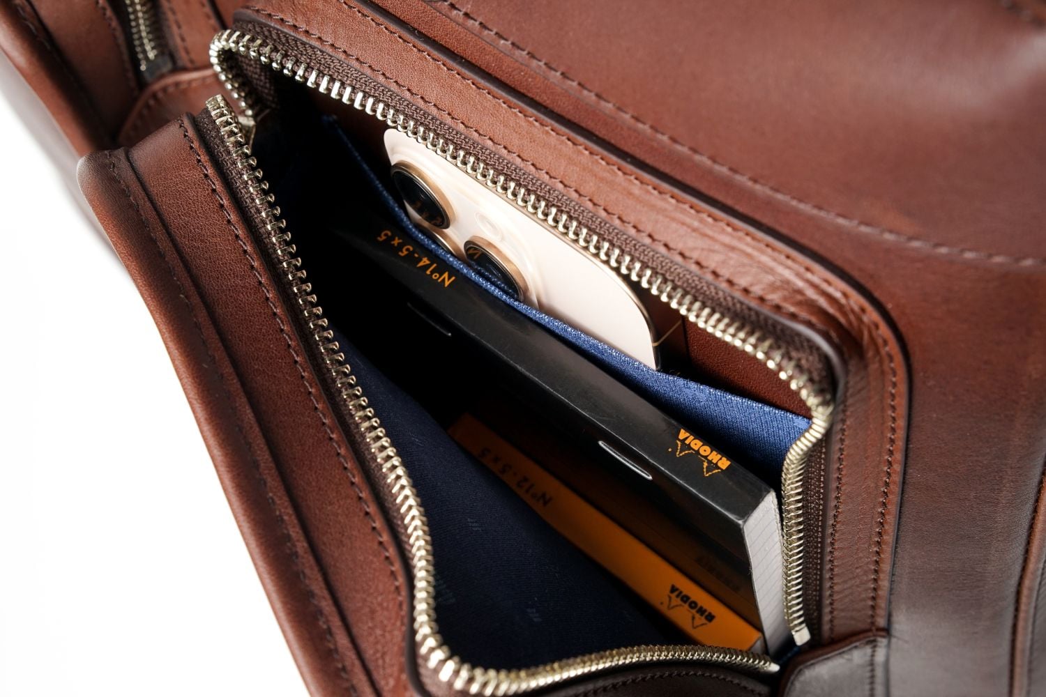 前面に2か所備えたポケットは、マチのあるボクシーなデザインで長財布やポーチも収納できるほどの大容量。鞄本体の収納力を犠牲にすることなく日常よく使う小物を収納できます。