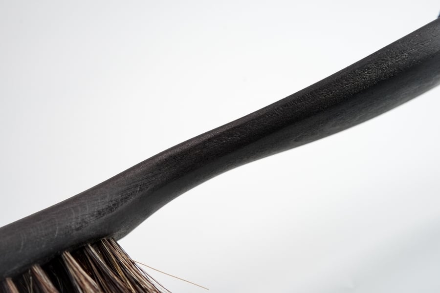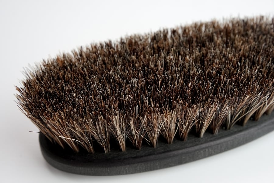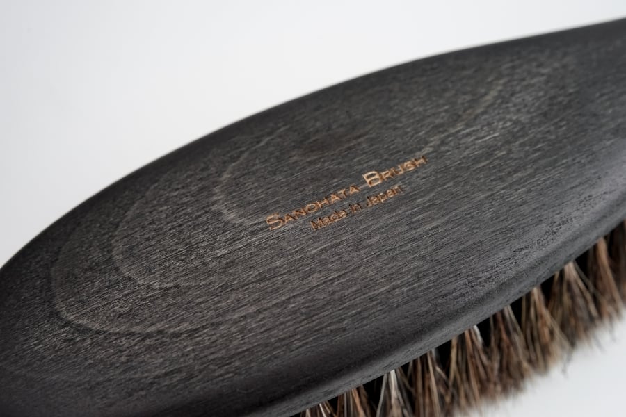 職人の目利きにより、ブラシに適した耐久性と弾力性を持つ毛質の良い馬毛のみを使用しています。皮革用ブラシに比べ毛足を長く採り少し間隔をあけることにより、デリケートな素材にも使える柔らかなタッチを実現しています。馬毛は静電気を帯びにくく、洋服へのほこりの再付着を防ぎます。