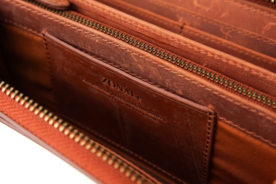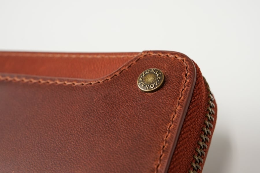 ワイルドな表情のオイルレザーとオリジナルのリベットが個性を主張するラウンドファスナー長財布。