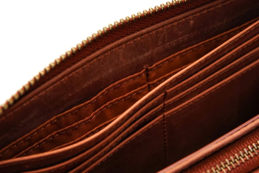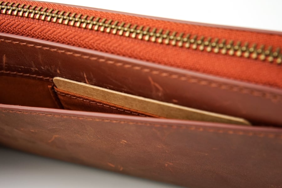 使用頻度の高いカードは中央にあるポケットへ。オイルレザーは使うほどに味わいが深まります。
