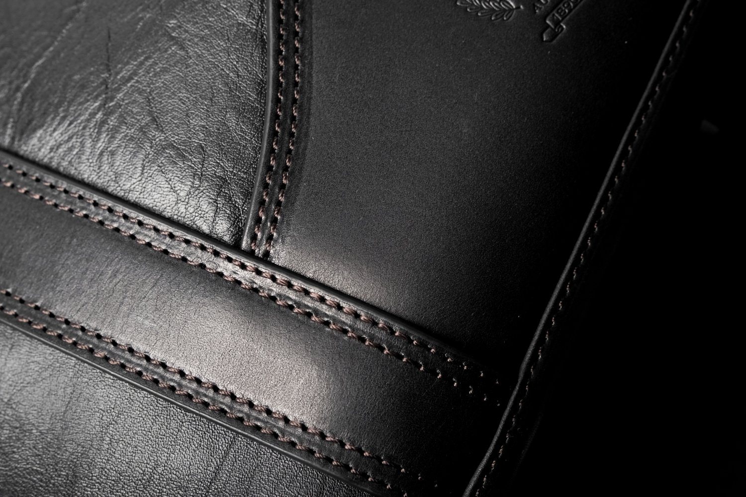 本格的な革ジャンやブーツなどに見られる「茶芯」レザーを独自に再現。タンニンのプールに漬け込むピット鞣しで繊維の中までじっくりとタンニンを含侵させた堅牢な馬革をベースに、茶色に染色した後黒の顔料を吹き付けて仕上げています。使い込むほどに下地の茶色が現れ、ヴィンテージのような味わい深い表情に変化します。