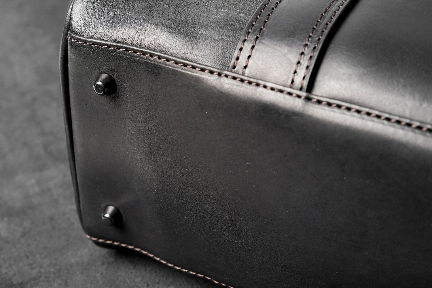 底部とハンドルには厚口オイルドレザーを附属。3mm厚のヌメ革に手塗りで何度もオイルを塗りこむことにより、奥行きのある豊かな表情が生まれ革の耐久性を高めています。手に馴染むしっとりとしたタッチと使うほどに見せる経年変化が魅力です。糸が「ミ」の字に整然と並ぶ、菱針による力強く美しいステッチワークを効かせ、要所にはワークウェアなどに見られるダブルステッチを施し補強しています。