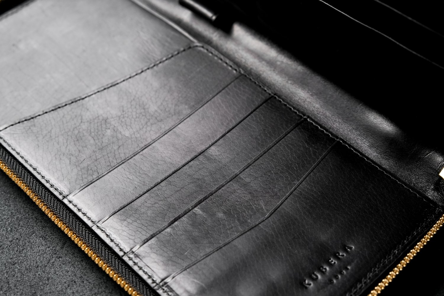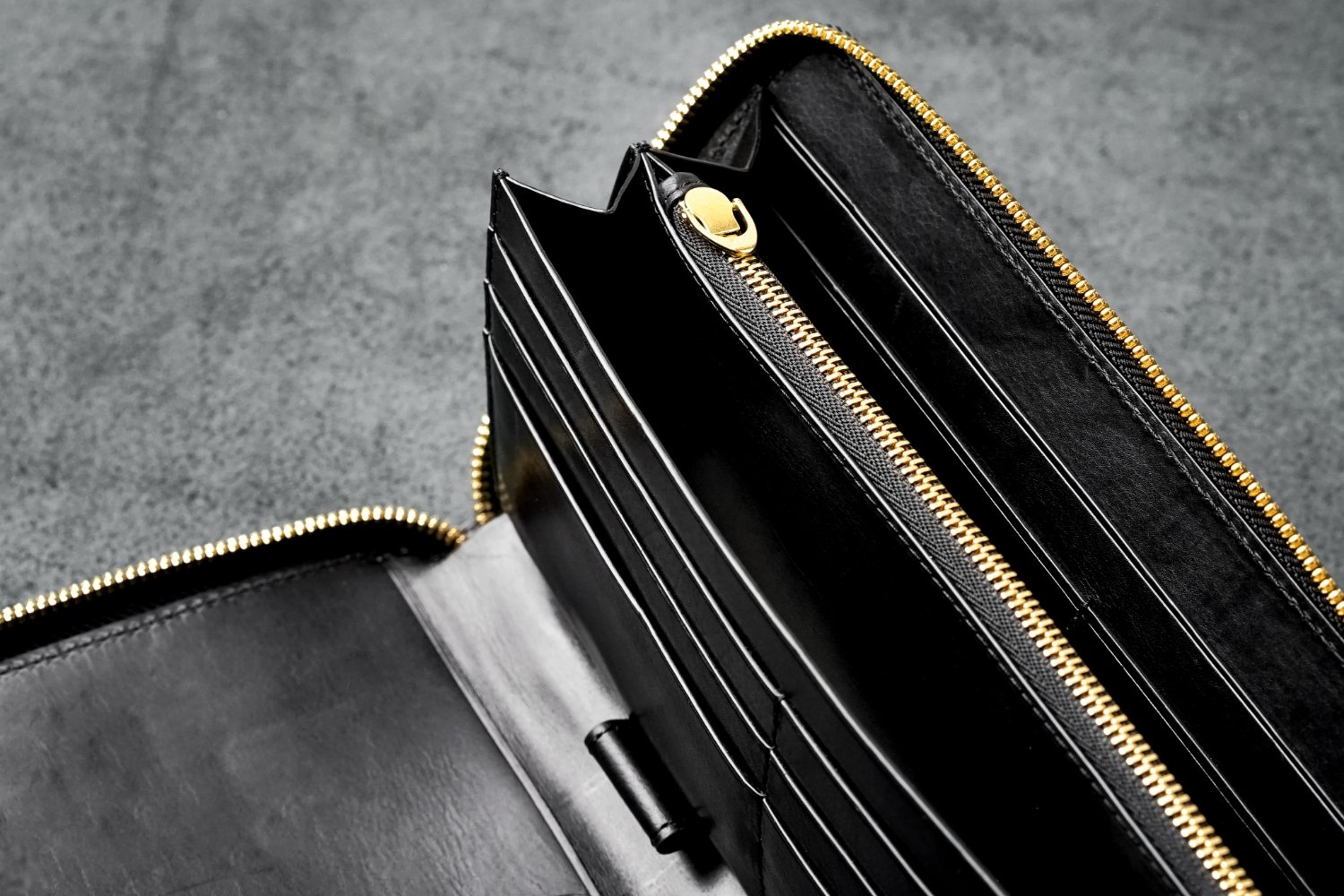 大きく開くフルオープン仕様に蛇腹式の札入れを装備した機能的な内装は、視認性が良く出し入れがしやすい設計。紙幣や領収書などの仕分けができ、計16枚のカードを収納できます。滑らかさと耐久性が求められる小銭入れのファスナーにはYKK最高級の「エクセラ®」を採用。