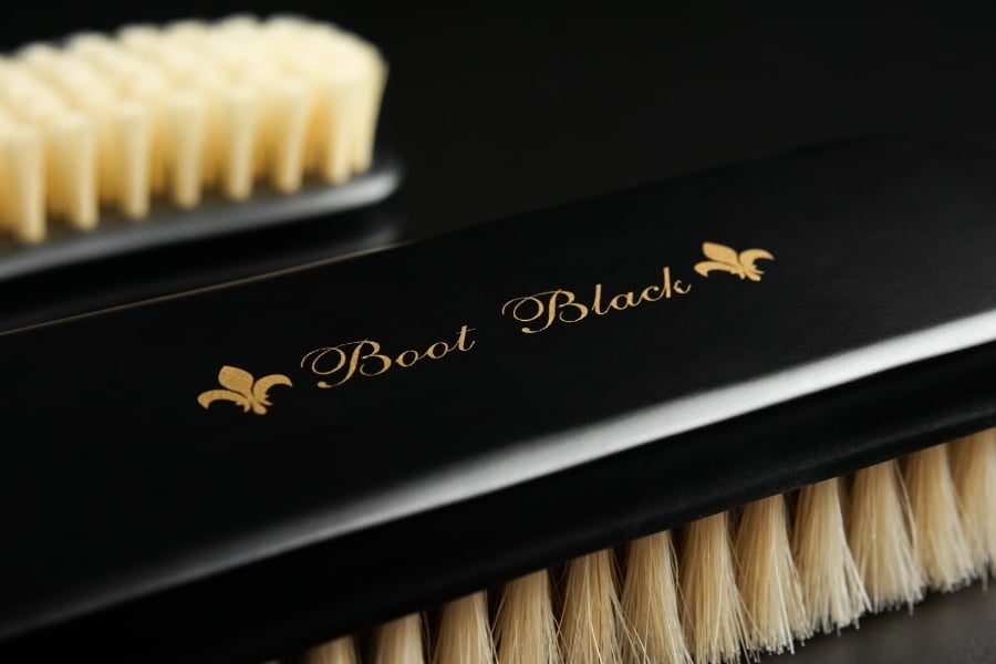 美しく黒塗りされたハンドルには側面にくぼみを付け、持ちやすく加工しています。適度な厚みとともに、握りやすく動かしやすいという靴磨きのプロならではのこだわりが反映されています。
