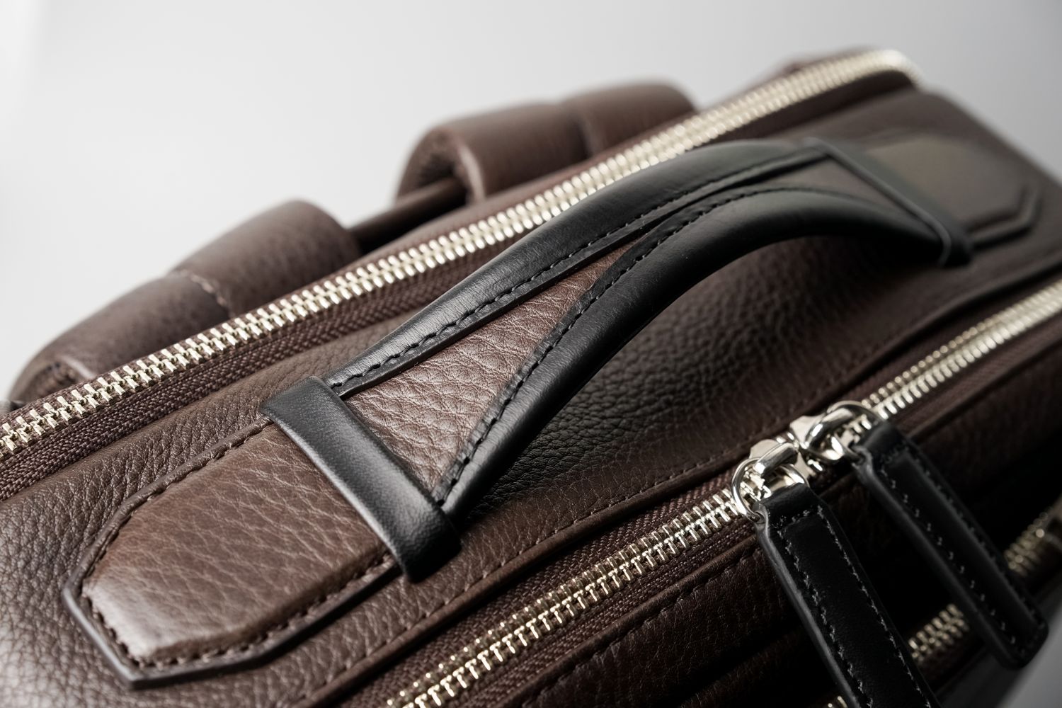 柔らかな本体革を堅牢なヌメ革で包み込んだデザイン。快適で疲れにくい握り心地と耐久性を兼ね備えています。縦横どちらでも持てるよう、上面と側面の2か所に装備しています。