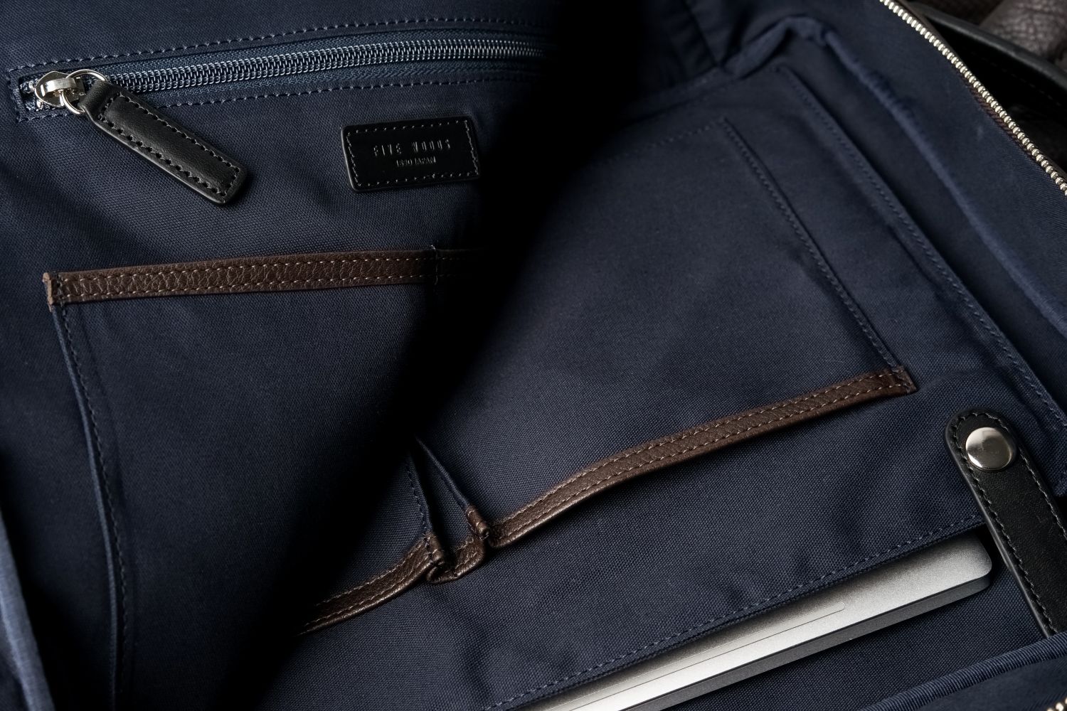 A4ファイルが余裕を持って収納できる内装。縦向き、横向きの両方で対応できるよう、向きが異なるポケットを組み合わせています。クッション性のあるPCスリーブには13インチのラップトップが余裕で収納可能。スナップボタンを閉めなければ15インチまで対応できます。