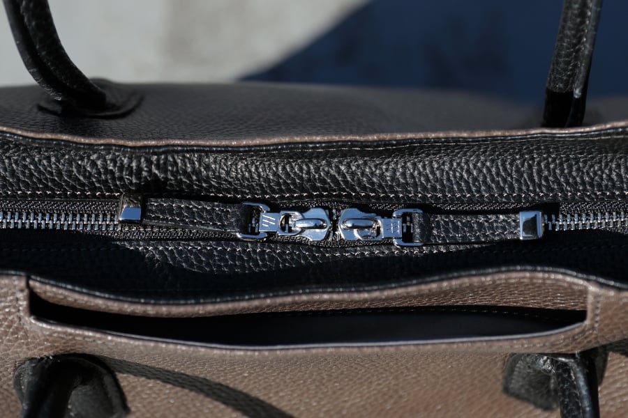 ファスナーは頭合わせにしてあるため、左右どちらからでも開閉ができストレスがありません。引き手には金具のキャップを付けて、掴みやすくしています。