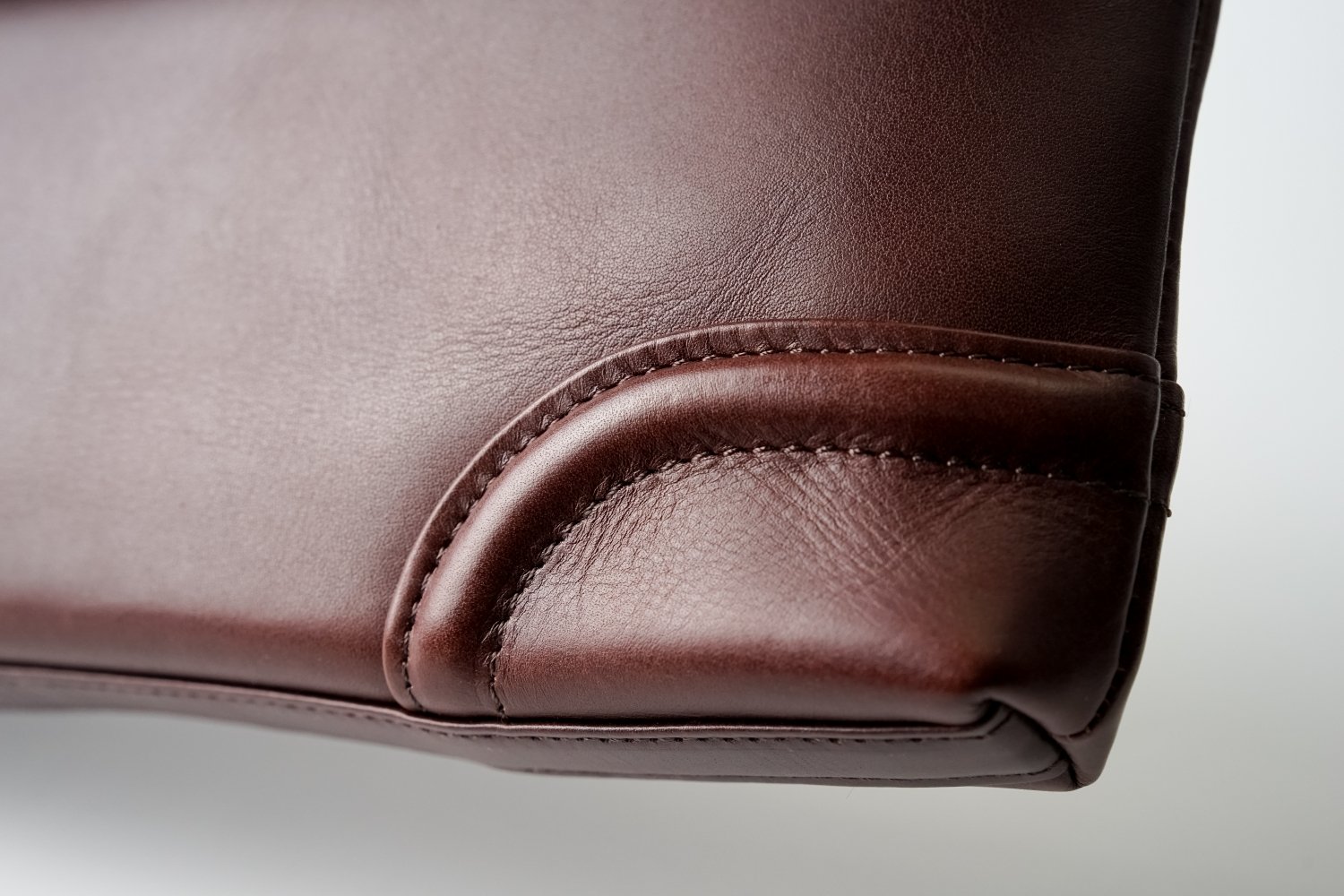 独特の立体的なフォルムを形成するためコーナーを補強。古来より強度の求められる馬具などに用いられてきた伝統的な技法で、長く使っても型崩れしにくい構造に。デザイン上のアクセントにもなっていますが、意味のある機能的なディテールなのです。