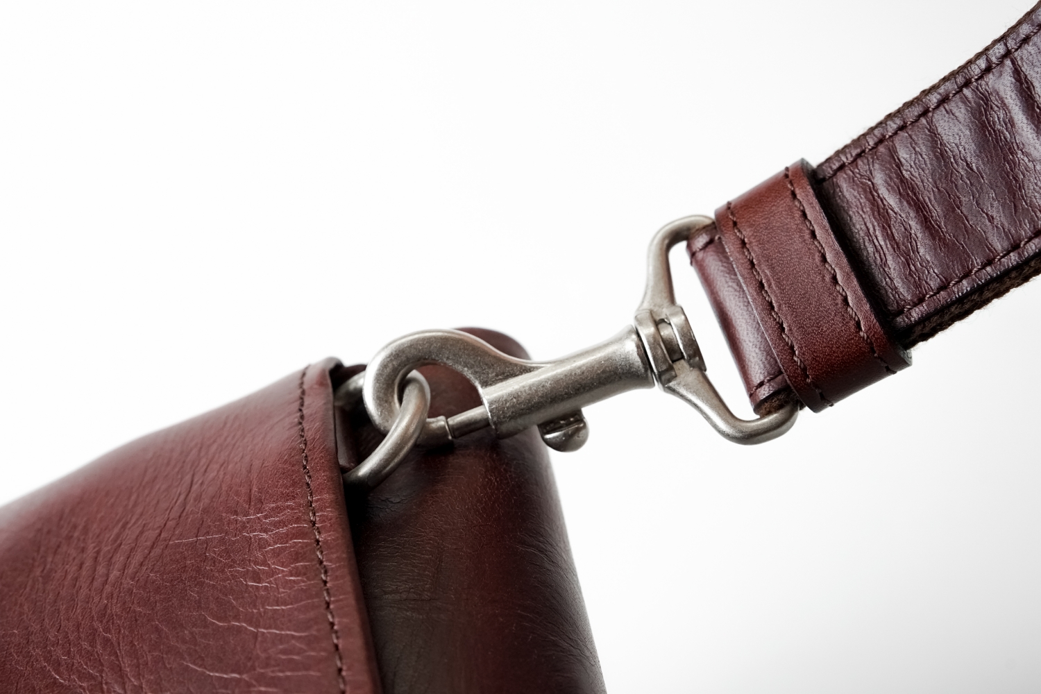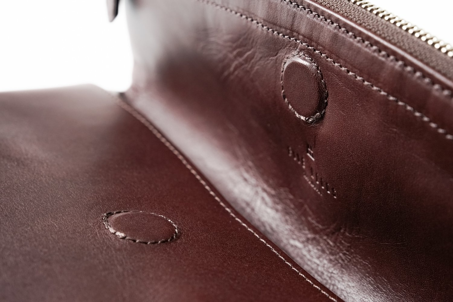 ショルダーストラップを取り外してクラッチとしても使用できる2WAY。ストラップは本体と同じレザー製で裏側には補強と色移り防止のためにファブリックテープを貼りあわせています。
