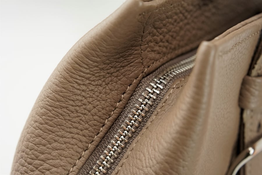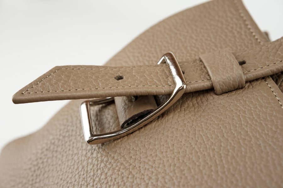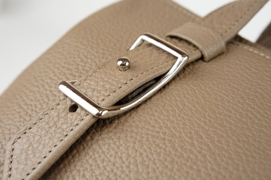 特徴的なベルトハンドルを留めるのは、「へそ舟」と呼ばれるクラシカルな意匠を持った真鍮製バックル。シンプルなデザインにアクセントを加えます。