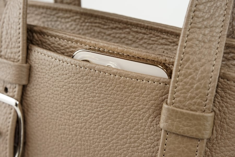 スマートフォンやパスケースなどを収納するのにちょうど良い小型ポケット。どちらの手でも使いやすい中央に、デザインを邪魔しないよう目立たずに配置しました。