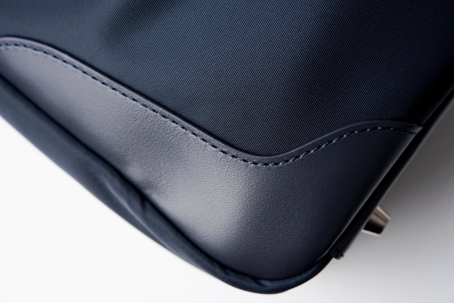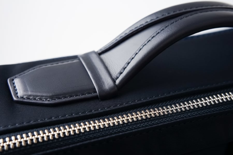 全体を引き締めるのはハンドルやコーナーに配した姫路産スコッチガード™レザー。防水スプレー並みの防水防汚効果が期待でき、要所を補強します。