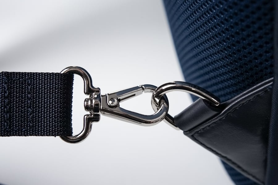 ハーネス取り付け部に用いられるナスカンと呼ばれる金具。負荷がかかりやすいため、抜け落ちしにくいリングを挟み込んだ高強度タイプを採用しました。