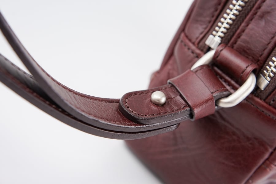 ポーチとして手で持つ際に安心感を与えるハンドル。本体と同じくレザーで仕立てました。