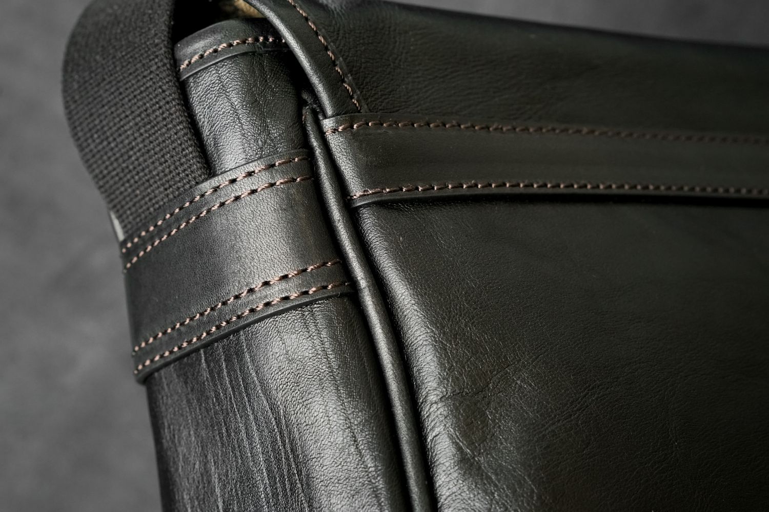 要所には厚口オイルドレザーを附属。3mm厚のヌメ革に手塗りで何度もオイルを塗りこむことにより、奥行きのある豊かな表情が生まれ革の耐久性を高めています。手に馴染むしっとりとしたタッチと使うほどに見せる経年変化が魅力です。糸が「ミ」の字に整然と並ぶ、菱針による力強く美しいステッチワークを効かせています。