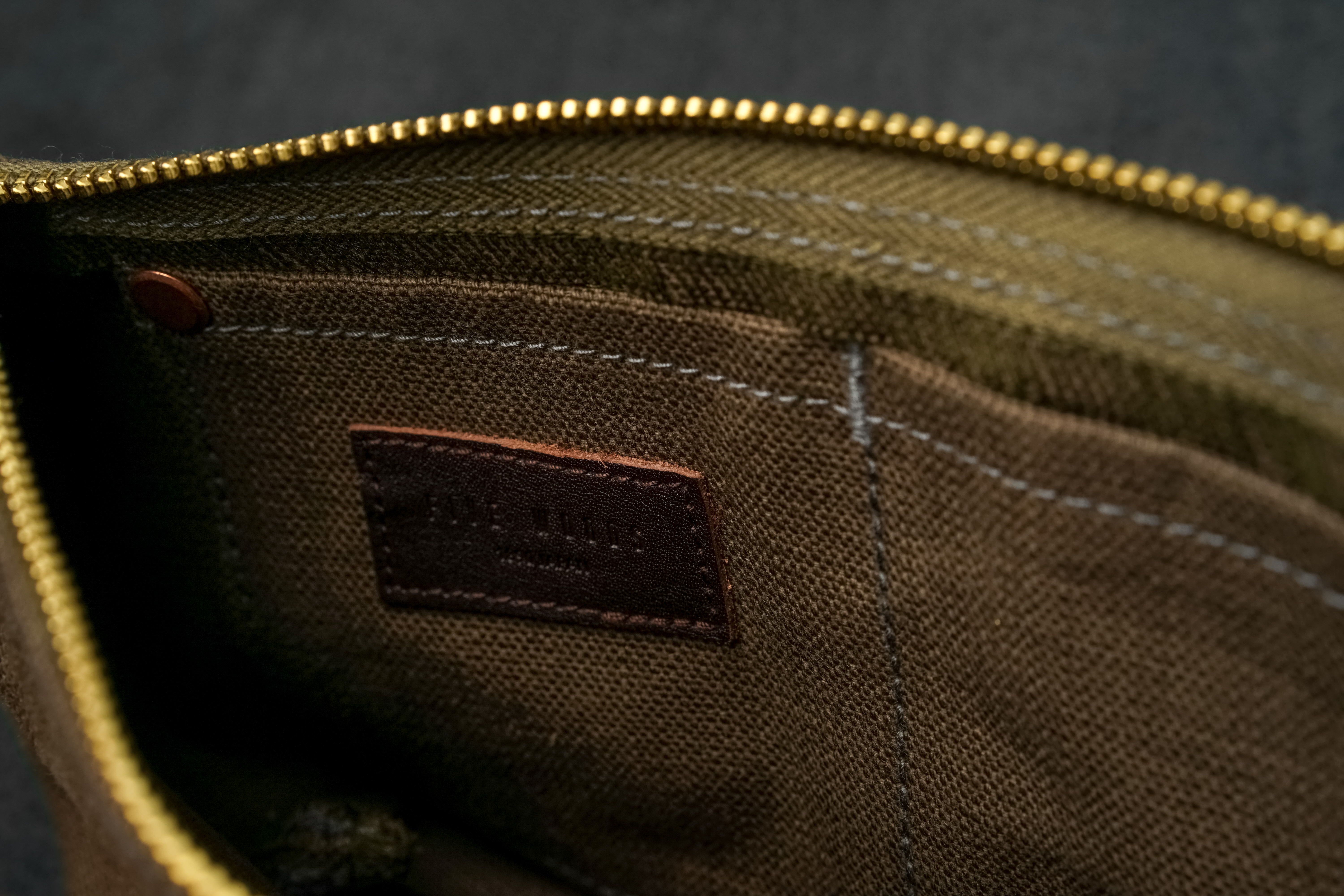 内装は裏地を貼らず素材の魅力をダイレクトに味わえる一枚仕立て。細かい物を仕分けできるポケットにも、本体と同じ素材を使用しステッチの端はリベットとバータックで補強しています。