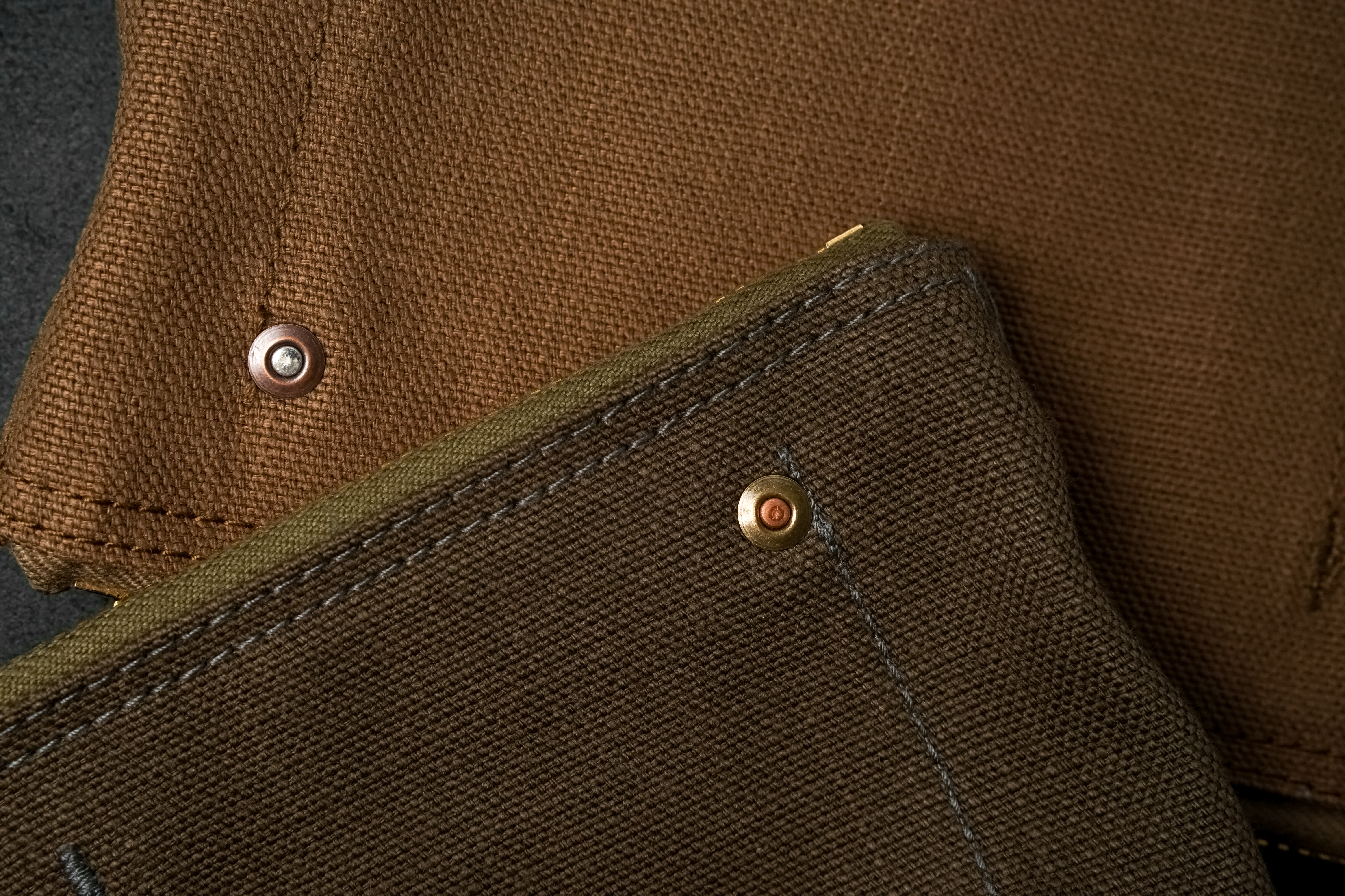 要所にはワークウェアのように金属リベットやバータックステッチなどで補強。リベットは、カーキのコットンダックには真鍮とカッパーを組み合わせた2色使い、ベージュにはカッパーと亜鉛合金の2色使いで、さりげなくスパイスを効かせます。
