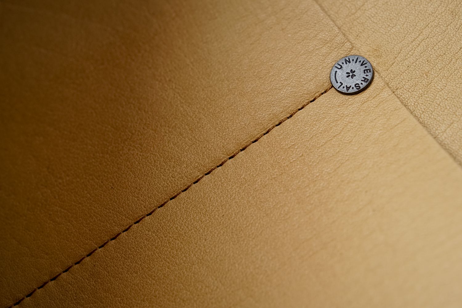 内装は裏地を貼らず革の魅力をダイレクトに味わえる一枚革仕立て。細かい物を仕分けできるポケットにも、本体と同じウォッシャブルレザーを使用し、UNIVERSALのリベットで補強しています。