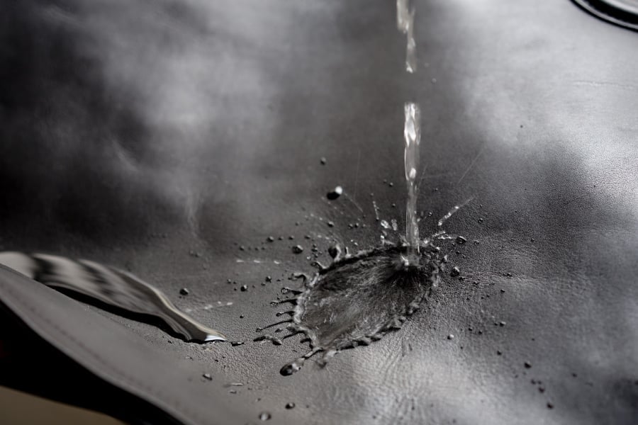 革の中に浸透したオイルと表面に施したワックス成分によって急な雨水をも弾きます。濡れたまま放置するとシミができてしまいますが、シミ跡が目立ちにくいのも特徴。 濡れた後は完全に乾燥させてからお手入れされることをおすすめします。