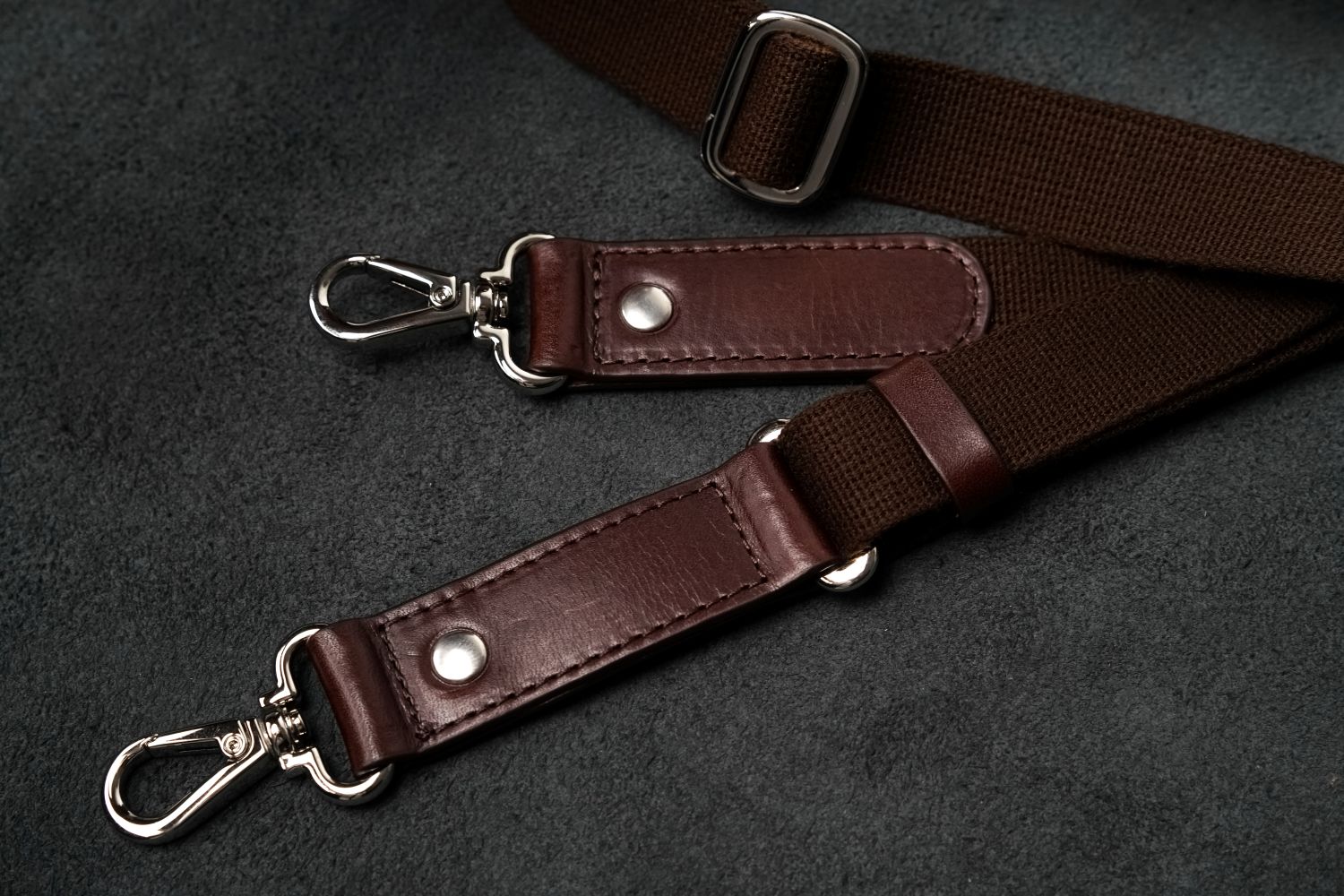 軽く滑りにくく、耐久性の高いアクリルテープ製ストラップを採用。両端は本体と同じオイルドレザーでトリミングし高級感を与えています。