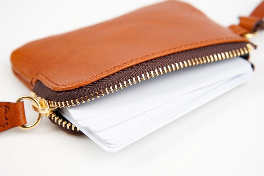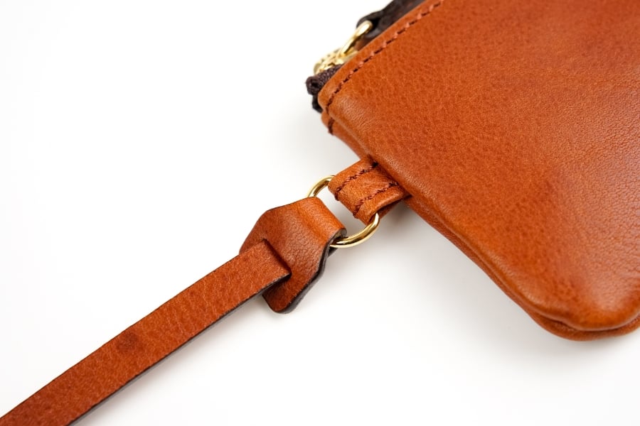多用途に使えるカードサイズの小さなポーチ。カードのみなら8枚程度収納可能で、他に小銭や鍵、イヤフォンなど様々な小物を整理しておくのに便利です。レザーストラップでバッグなどに取り付けることも、ストラップを外して単体で使用することも可能です。