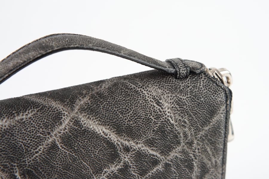 象革は市場にほとんど流通しない希少な素材です。個性的でワイルドな表情は他の素材に無いユニークなもので、水分や傷にも強い高い耐久性が特徴です。「AI」カラーは徳島の無形文化財「阿波正藍染め」、「SUMI」カラーは同じく徳島の伝統技法「松煙墨染め」で染め上げた特別な素材です。