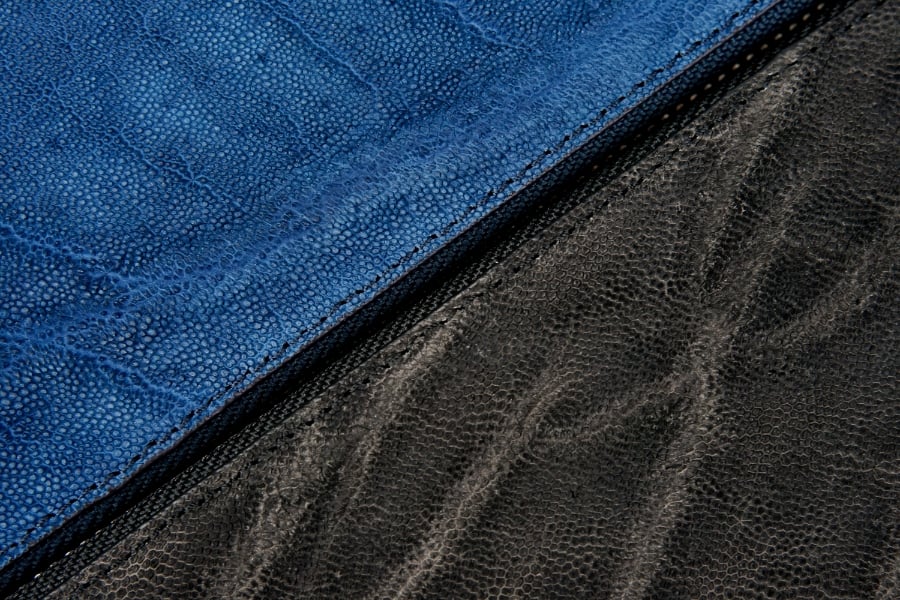 象革は市場にほとんど流通しない希少な素材です。個性的でワイルドな表情は他の素材に無いユニークなもので、水分や傷にも強い高い耐久性が特徴です。「AI」カラーは徳島の無形文化財「阿波正藍染め」、「SUMI」カラーは同じく徳島の伝統技法「松煙墨染め」で染め上げた特別な素材です。