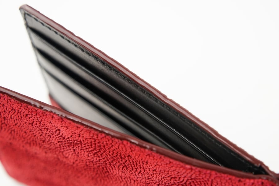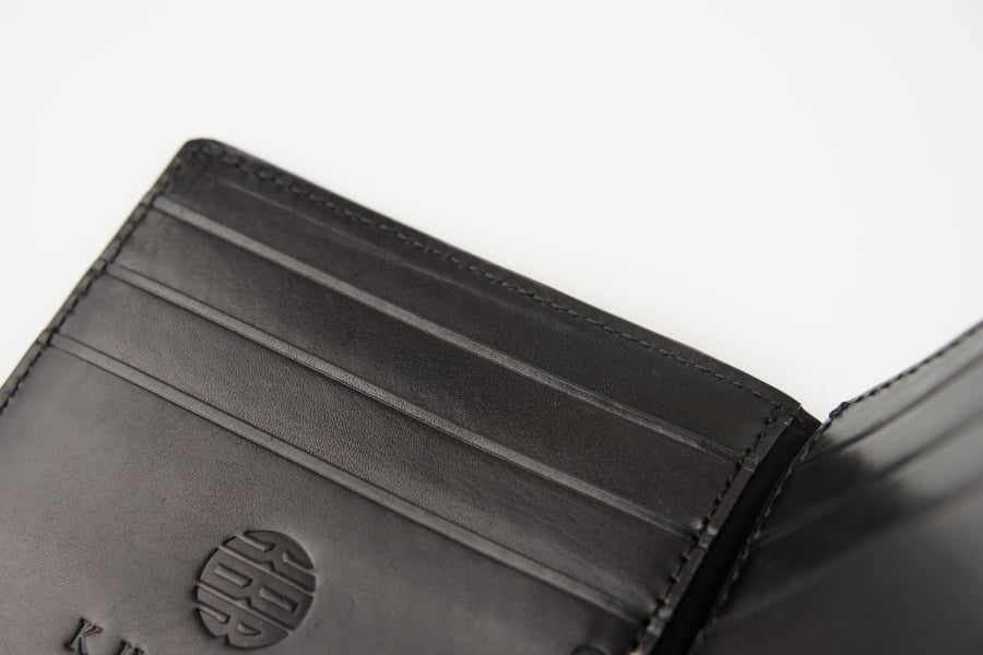 内装下部のコーナーにはコードバンをあてて補強。デザイン上のアクセントになりながら型崩れを防ぎます。 *紙幣を挟むためのものではありません。