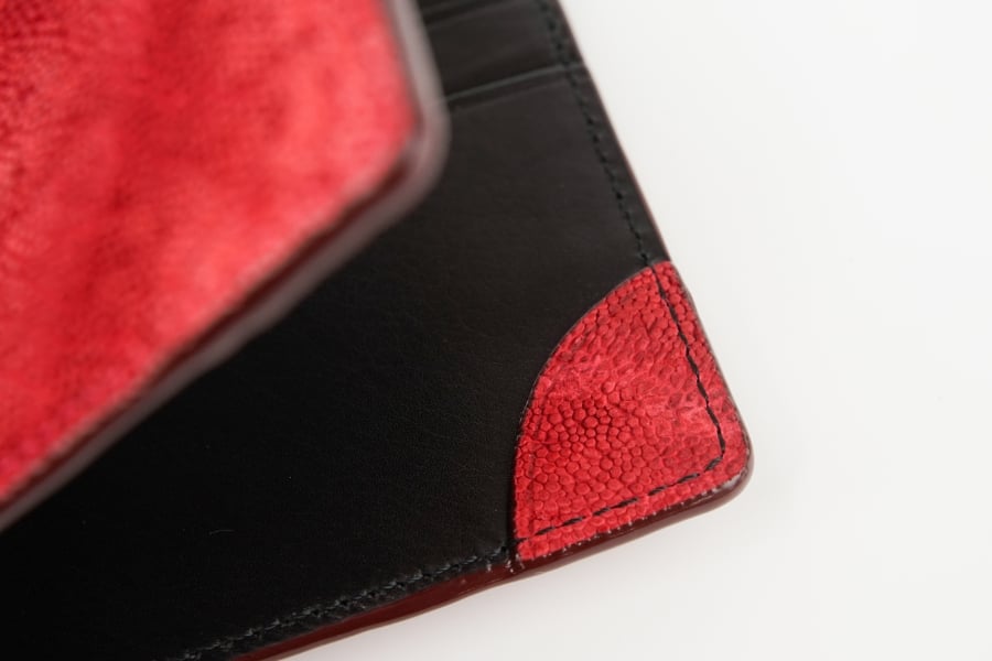 コバと呼ばれる革の裁断面は、何層にも重なる革が平らになるまで念入りに磨き上げてから、特性の樹脂を複数回に分けて塗り込み滑らかに仕上げています。手間のかかる製法ですが、これにより型崩れしにくく耐久性の高い製品となるのです。