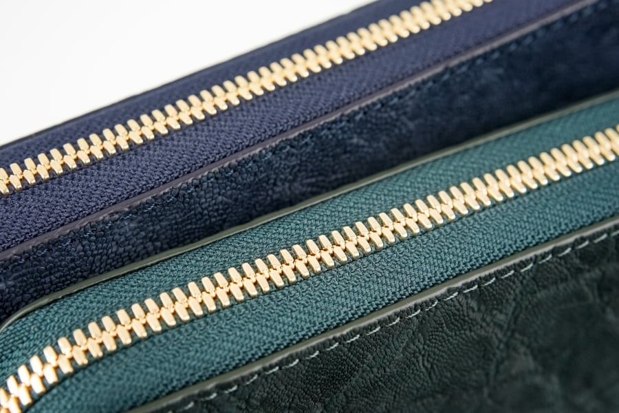 高品質を誇るYKKファスナーのなかでも最高級グレードとされる「エクセラ®」を使用。こちらはさらに「本金メッキ」を施した特別なタイプです。エレメント一つ一つに入念な研磨を施されたファスナーは美しく輝き、使うほどに滑らかに。噛み合わせも高精度で耐久性に優れており長くお使いいただくことが可能です。