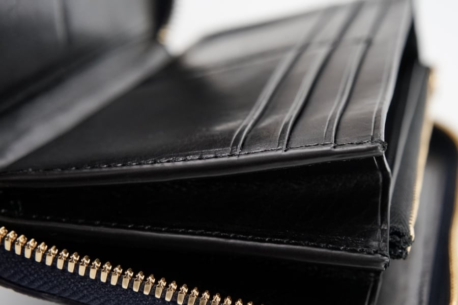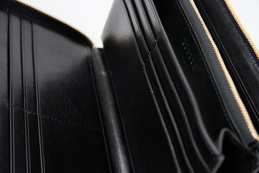 大きく開くフルオープン仕様に蛇腹式の札入れを装備した機能的な内装は、視認性が良く出し入れがしやすい設計。紙幣や領収書などの仕分けができ、18枚のカードを収納できます。滑らかさと耐久性が求められる小銭入れのファスナーにはYKK最高級の「エクセラ®」を採用。