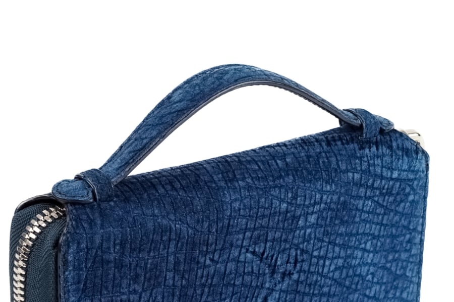 市場にほとんど流通せず希少性の高さではトップクラスの素材。四角い網目状の表情が個性的でワイルドですが、表面を軽く起毛させ上品に仕上げています。象革と同じく水分や傷にも強い高い耐久性も特徴です。「AI」カラーは徳島の無形文化財「阿波正藍染め」、「SUMI」カラーは同じく徳島の伝統技法「松煙墨染め」で染め上げた特別な素材です。