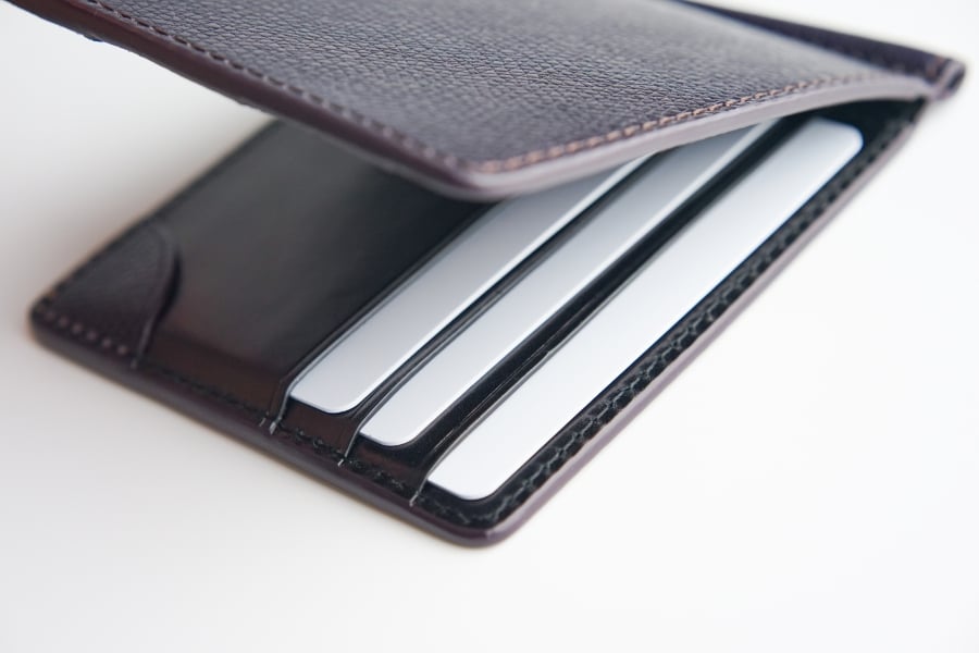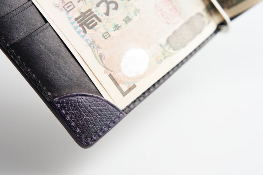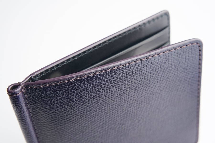 内装下部のコーナーにはコードバンをあてて補強。デザイン上のアクセントになりながら型崩れを防ぎます。 *紙幣を挟むためのものではありません。