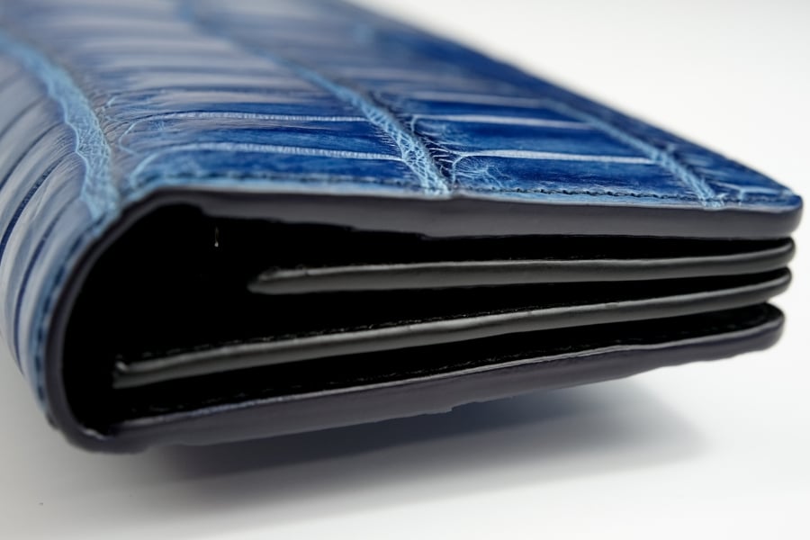 染料に浸けて洗う工程を何度も繰り返してじっくりと「藍」「墨」に染め上げたナイルクロコ。日本の美しい伝統色は奥ゆかしく、使うほどに色艶深く変化します。