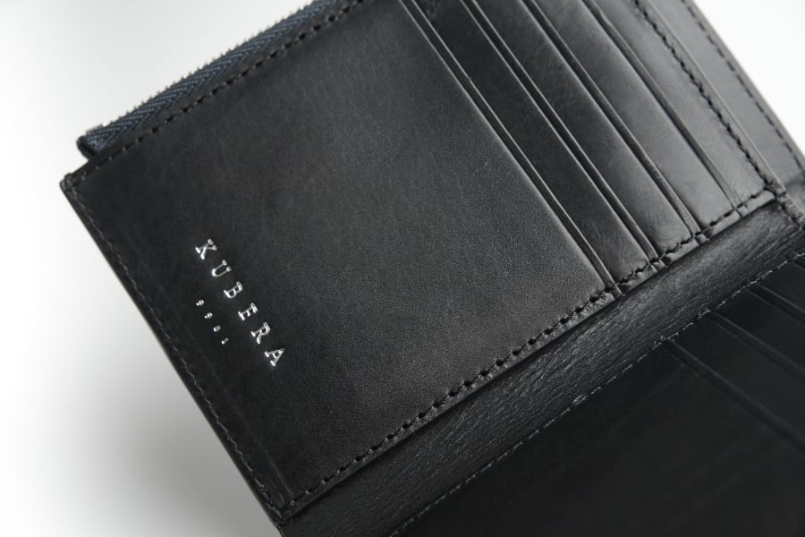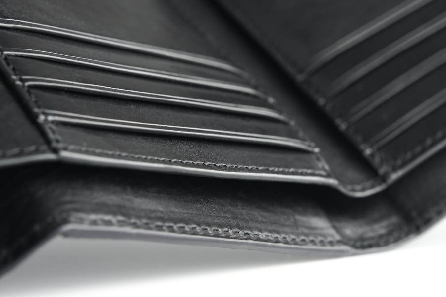 内装の大部分のパーツは両面が表皮になるよう2枚に貼り合わせています。それによりカーフレザーの柔らかさ・滑らかさに耐久性が加わり、従来の製品より数倍長持ちします。また、使い込むほどに馴染み味が出るため、経年変化も楽しむことができます。
