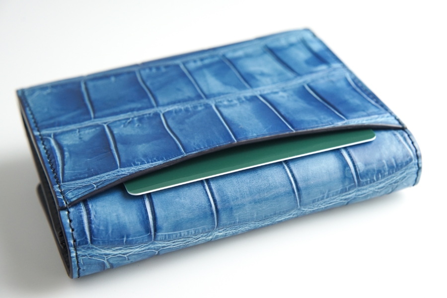 「藍染」で染め上げたナイルクロコ。古来よりジャパンブルーと言われた、日本の美しい伝統色は使うほどに色艶深く変化します。