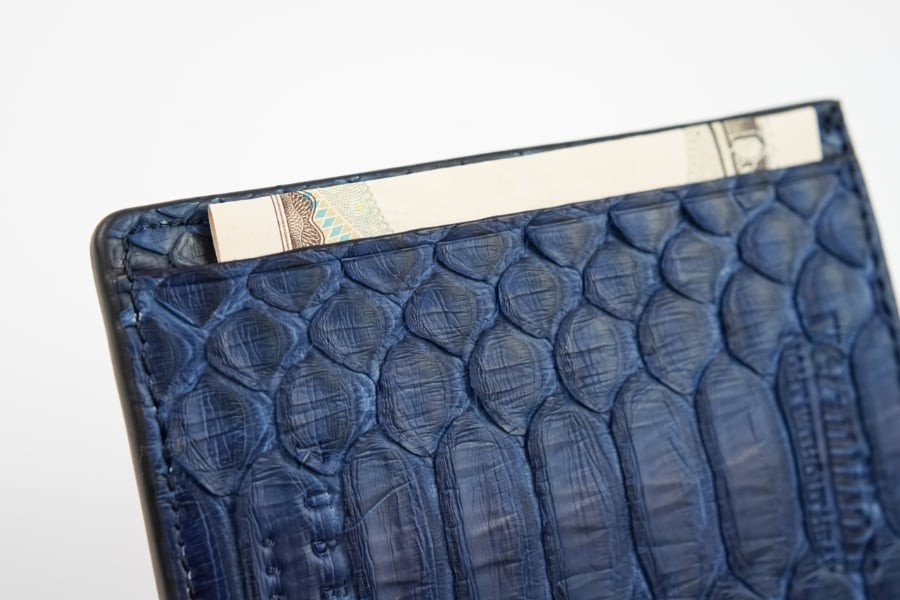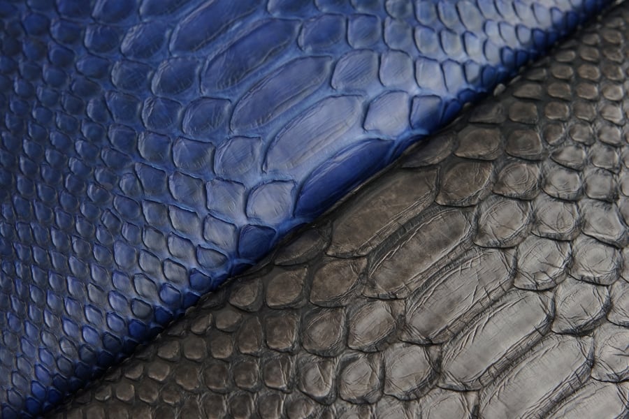 美しい柄を持ったタイヤモンドパイソンを、熟練職人が「藍」「墨」を用い丹念に染め上げた特別な素材。余計な表面加工は施さず、手触りの滑らかさと風合いの良さを最大限に活かしており、使うほどに艶を増していきます。エキゾチックレザーの開発やフルオーダーアイテムを手掛ける「Vermillion」との協業開発素材です。
