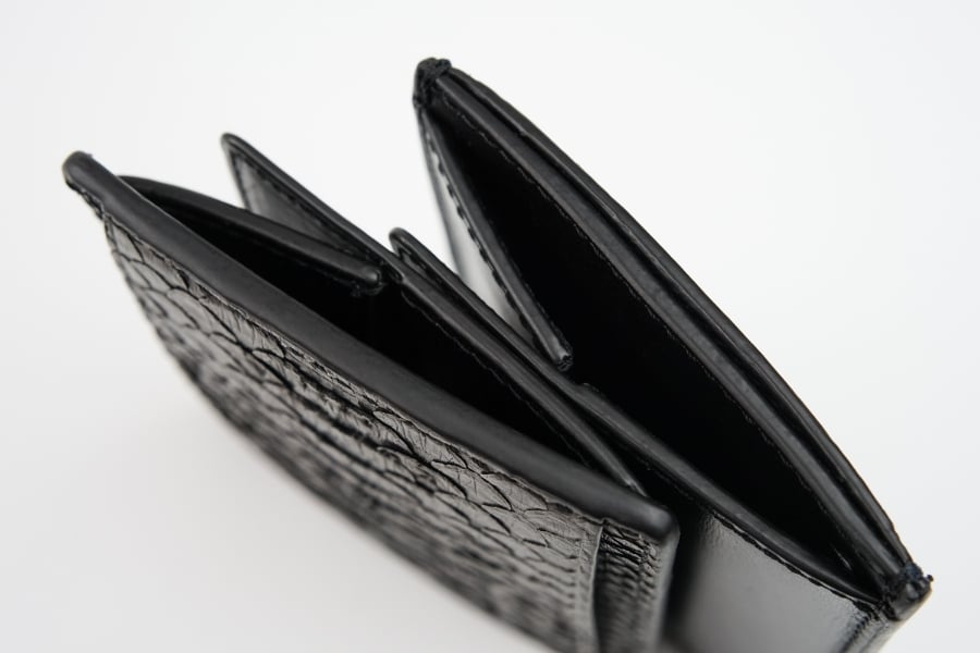 背面には二つ折りにした紙幣がジャストで収まる札ばさみ機能を追加。小銭、カードに加え紙幣も入れておくことでオールインワンのミニマム財布として使えます。