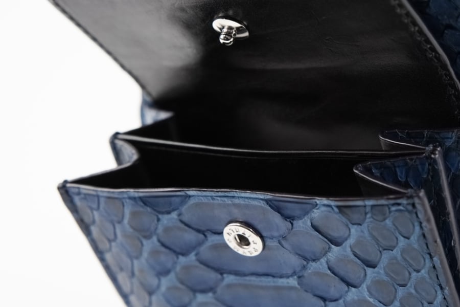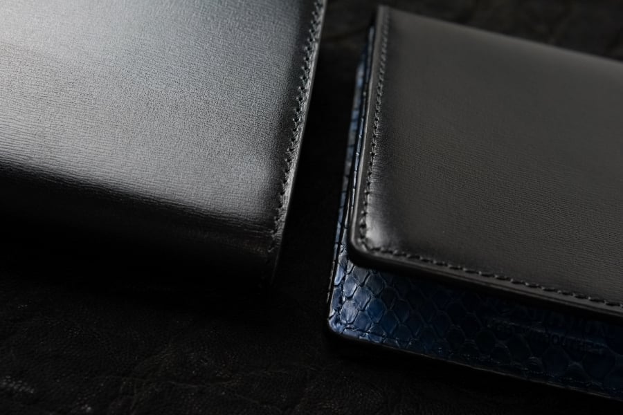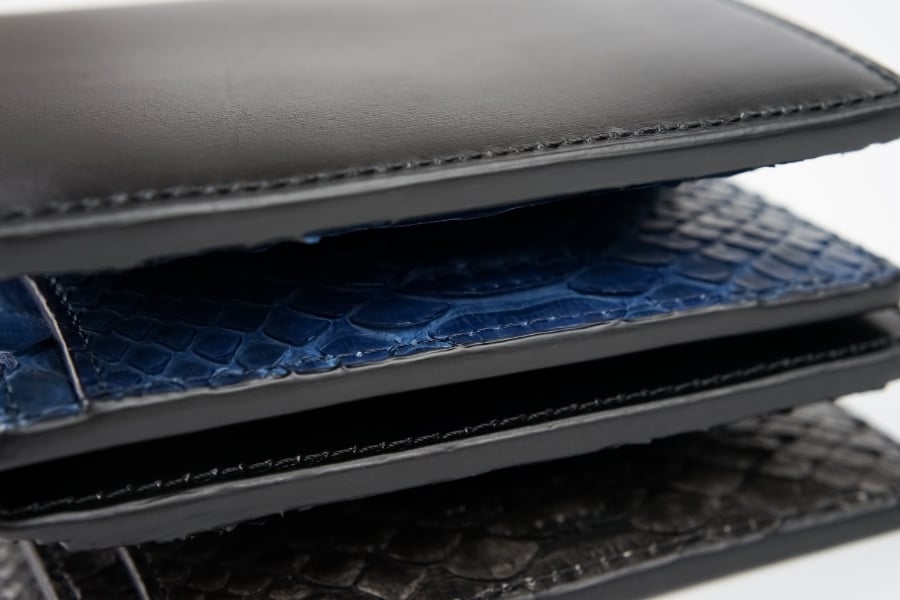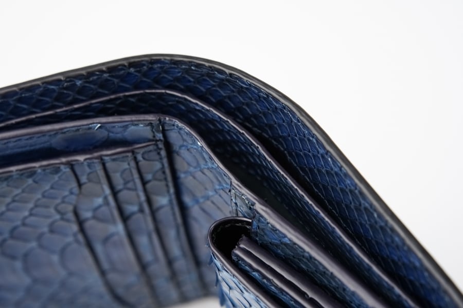 シンプルな外観は中に秘めた個性的なパイソンを際立たせます。 見えない裏貼りにもカーフを用いた贅沢な総革仕立てで、パイソンとカーフが幾重にも重なる重厚なコバには丹念に磨きと塗りを繰り返し、高い耐久性を持たせています。