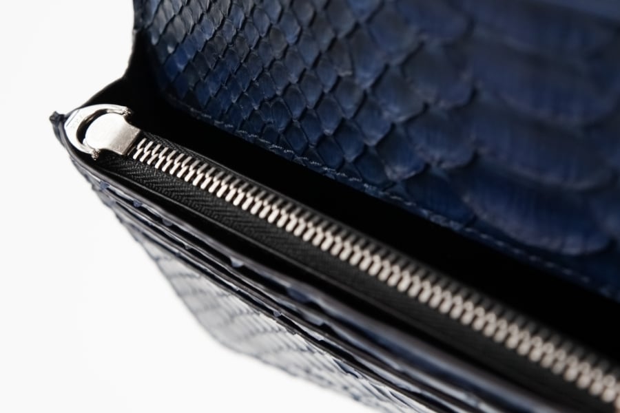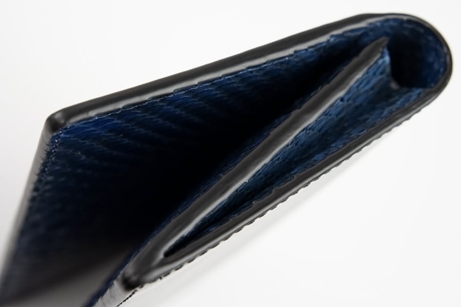 美しい柄を持ったタイヤモンドパイソンを、熟練職人が「藍」「墨」を用い丹念に染め上げた特別な素材。余計な表面加工は施さず、手触りの滑らかさと風合いの良さを最大限に活かしており、使うほどに艶を増していきます。エキゾチックレザーの開発やフルオーダーアイテムを手掛ける「Vermillion」との協業開発素材です。