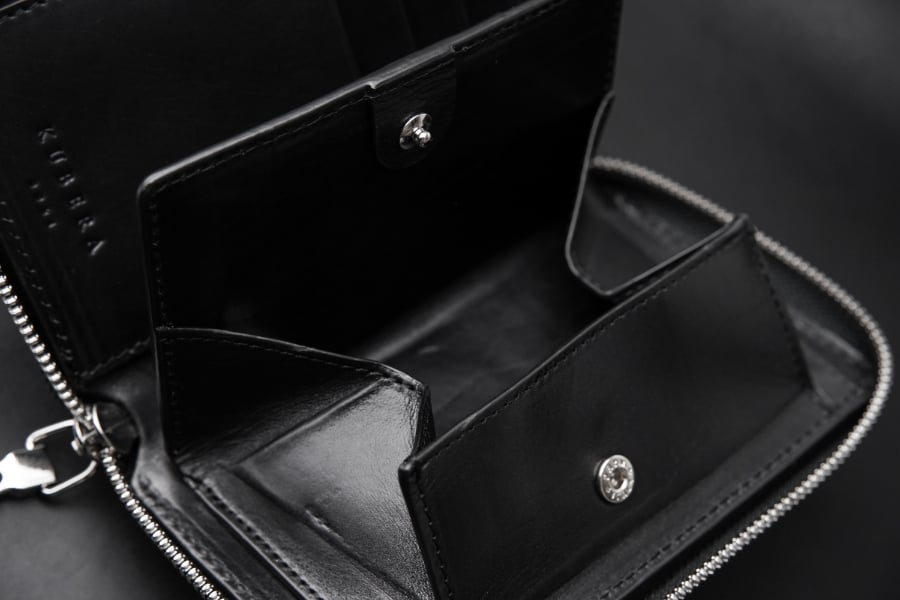 片側を縫い付けないオープン仕様なので大きく開くことができ、紙幣の取り出しもスムーズ。紙幣やレシートの整理がしやすい中仕切り付きです。総カーフ仕立ての贅沢で丈夫な独自仕様。