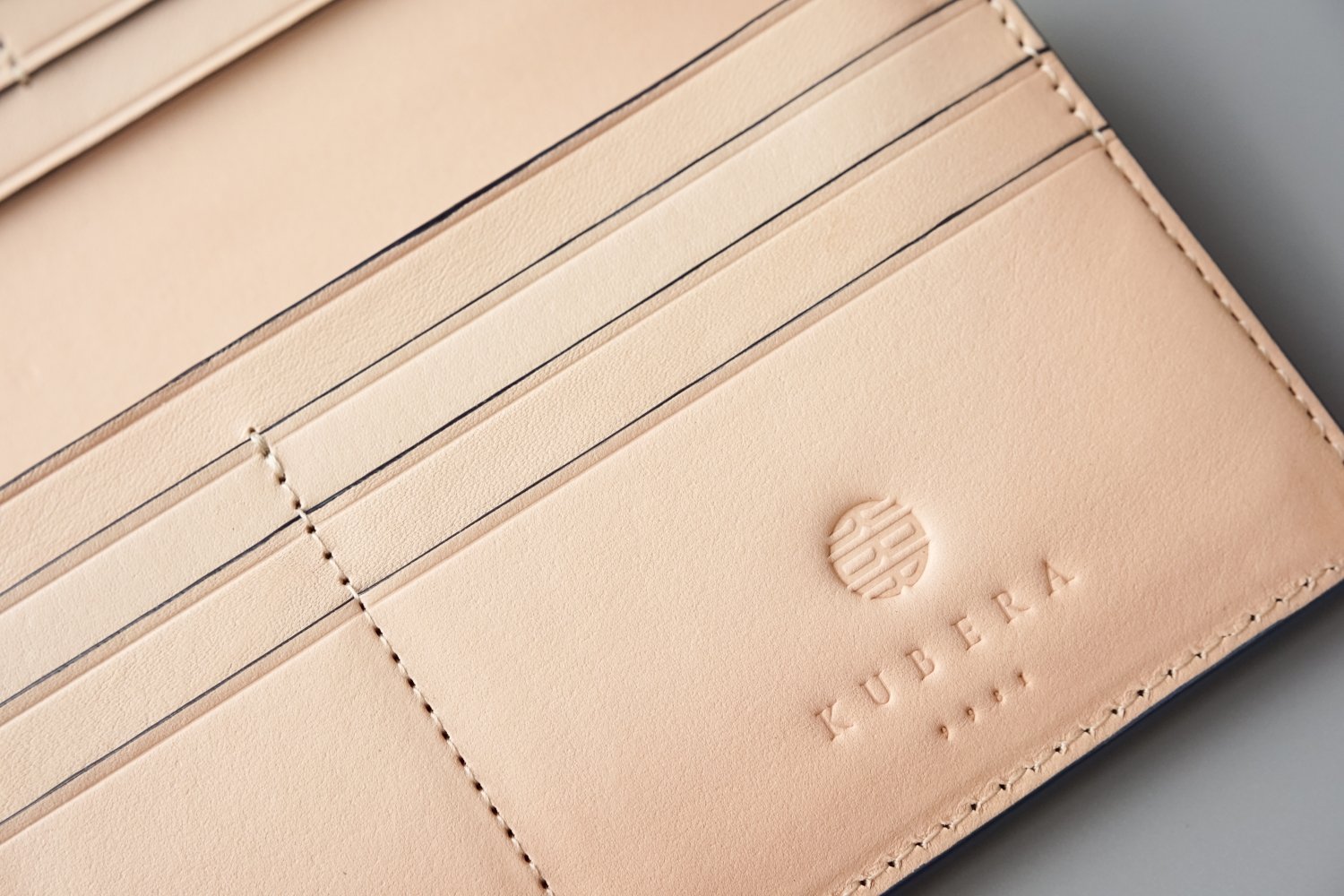 内装は、植物タンニンで鞣されたナチュラルなヌメ革を使用した総革仕立て。 それも、両面が表皮となるようヌメ革を2枚貼り合わせた特別に贅沢で丈夫な仕様です。これにより耐久性が増し長く経年変化を楽しみながらお使いいただけるようになっています。