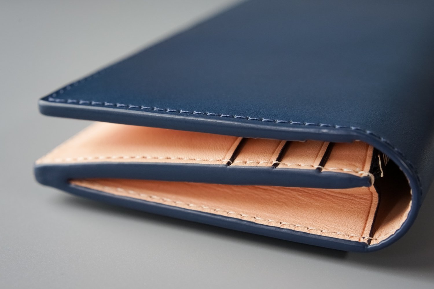 小銭入れとその両サイドにはマチ付きの札入れと、マチ無しのポケットを装備。紙幣と領収書などの仕分けが可能です。内部までヌメ革2枚合わせの贅沢な総革仕立てです。
