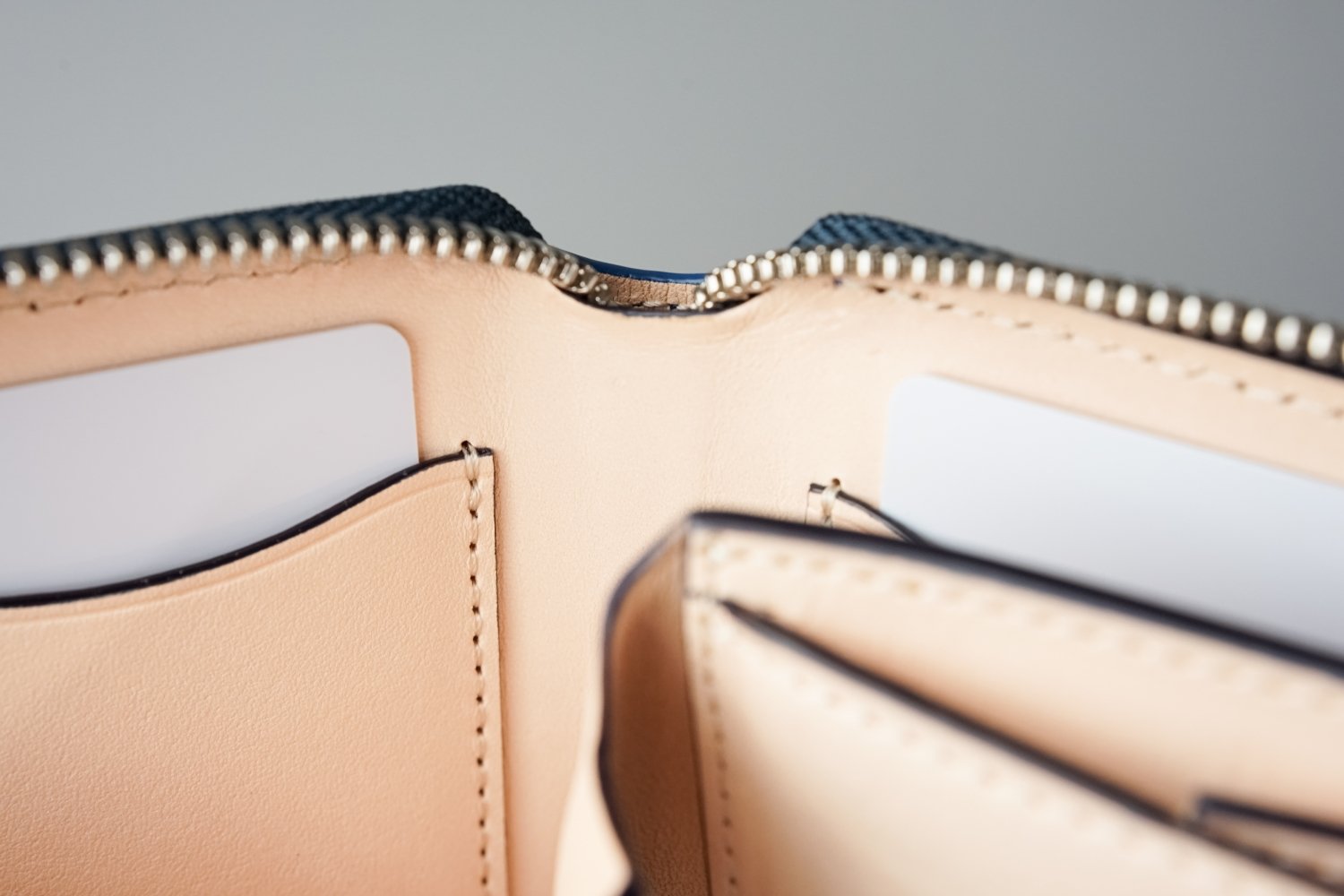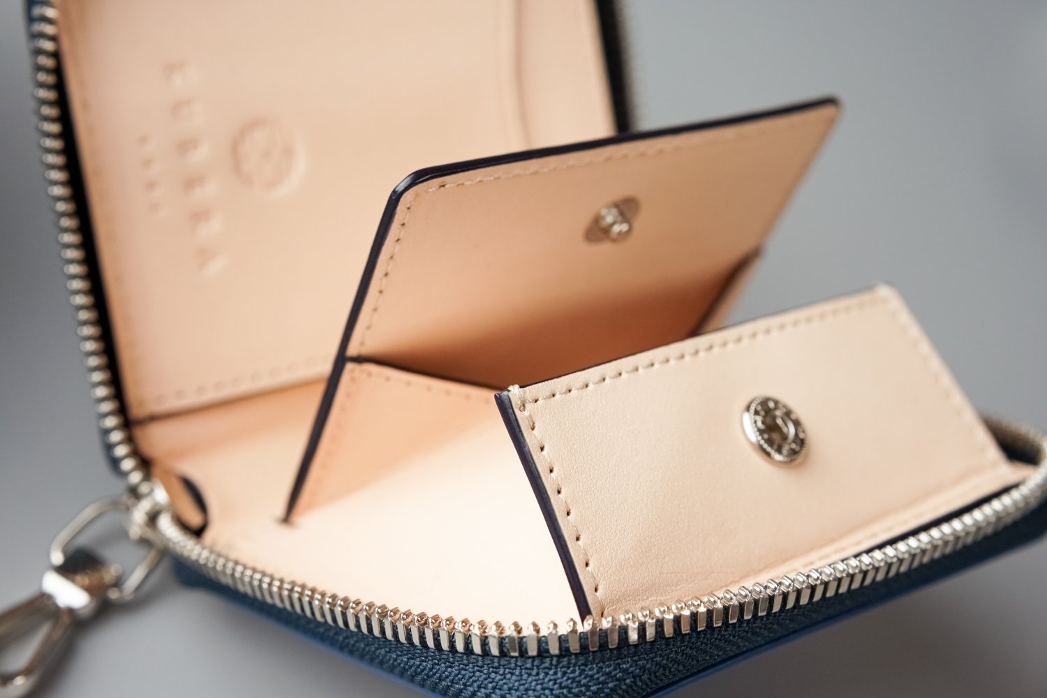 内装は、植物タンニンで鞣されたナチュラルなヌメ革を使用した総革仕立て。 それも、両面が表皮となるようヌメ革を2枚貼り合わせた特別に贅沢で丈夫な仕様です。これにより耐久性が増し長く経年変化を楽しみながらお使いいただけるようになっています。
