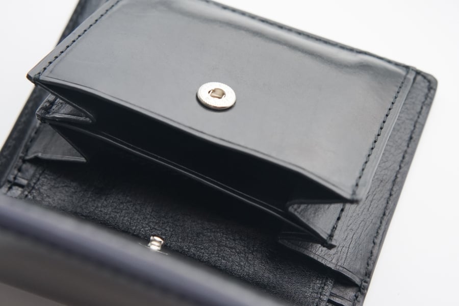 センターに設けられた中仕切りで仕分けがしやすい設計。 もちろん小銭入れも、すべて2枚合わせのカーフを用いた贅沢な総革仕立て。柔らかさと耐久性を両立させています。