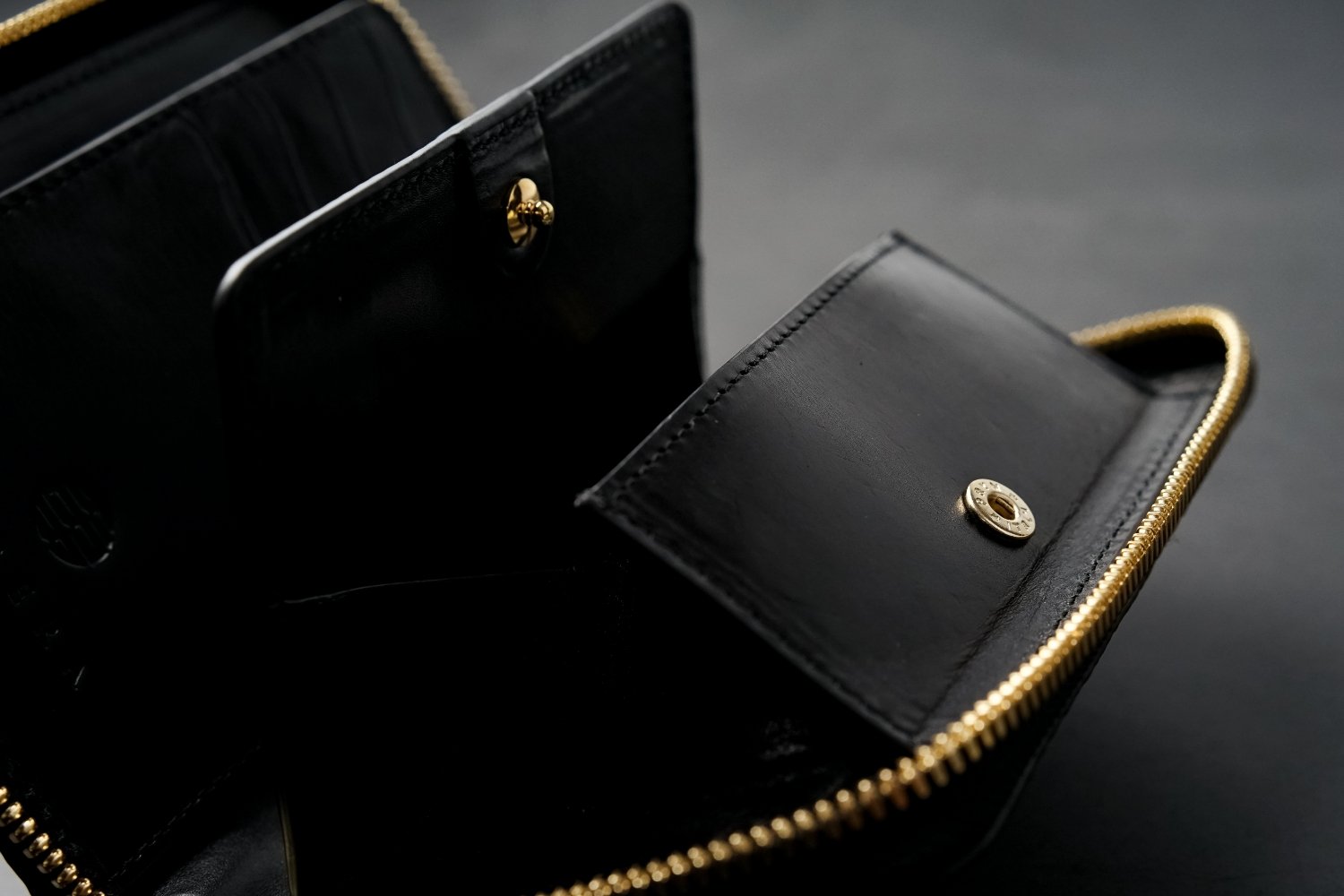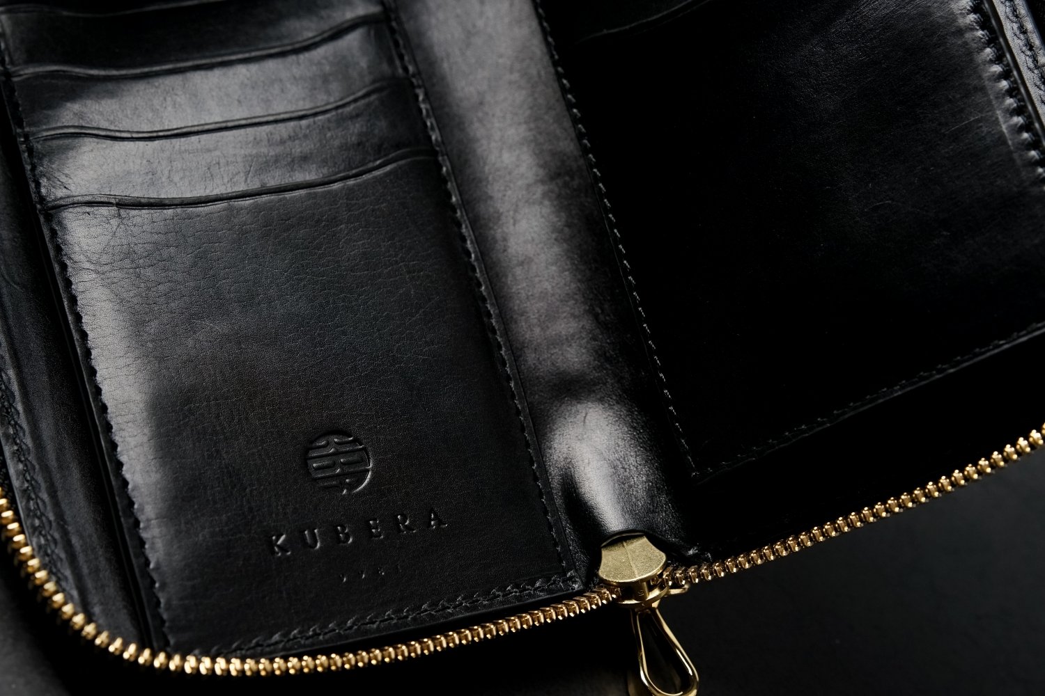 片側を縫い付けないオープン仕様なので大きく開くことができ、紙幣の取り出しもスムーズ。紙幣やレシートの整理がしやすい中仕切り付きです。総ヌメ革仕立ての贅沢で丈夫な独自仕様。