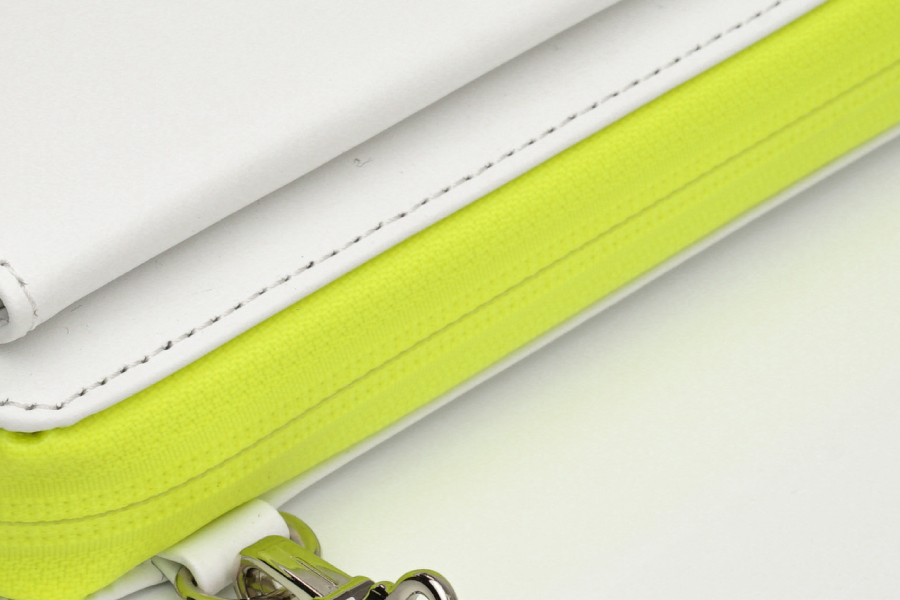 特殊技術により本革に防水加工を施し、ワンポイントでファスナーを蛍光色防水ファスナーにアレンジ! ありそうでなかった大人顔に仕上げました。