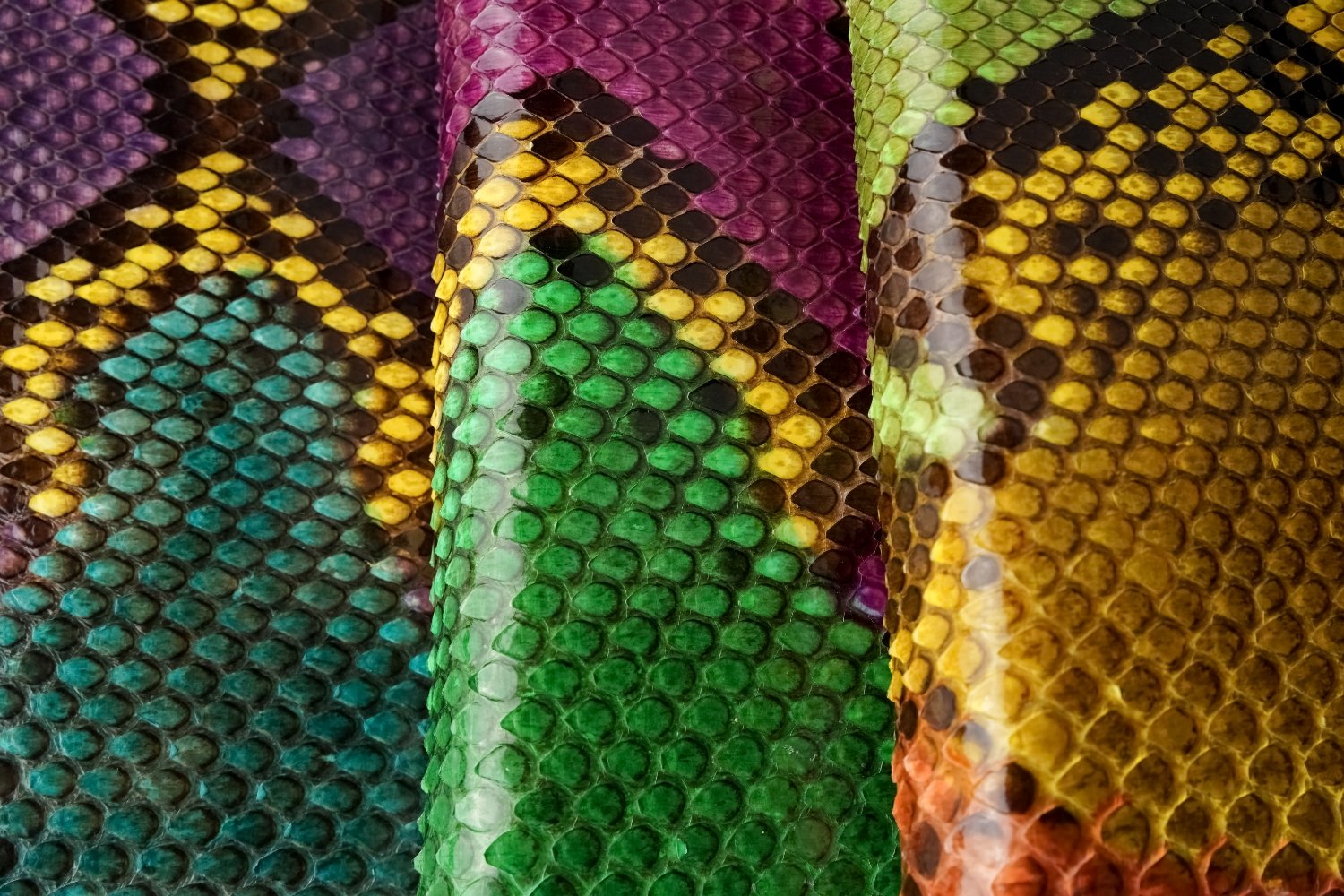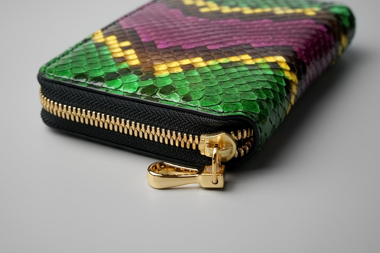 職人が一枚一枚、柄に合わせて手染めを施した唯一無二のダイヤモンドパイソン。絵画のように味わい深く、表面にはグレージング加工による美しい光沢を湛えます。鱗は余程強い力を掛けない限り簡単には剥がれず、長く経年変化を愉しみながらお使いいただけます。