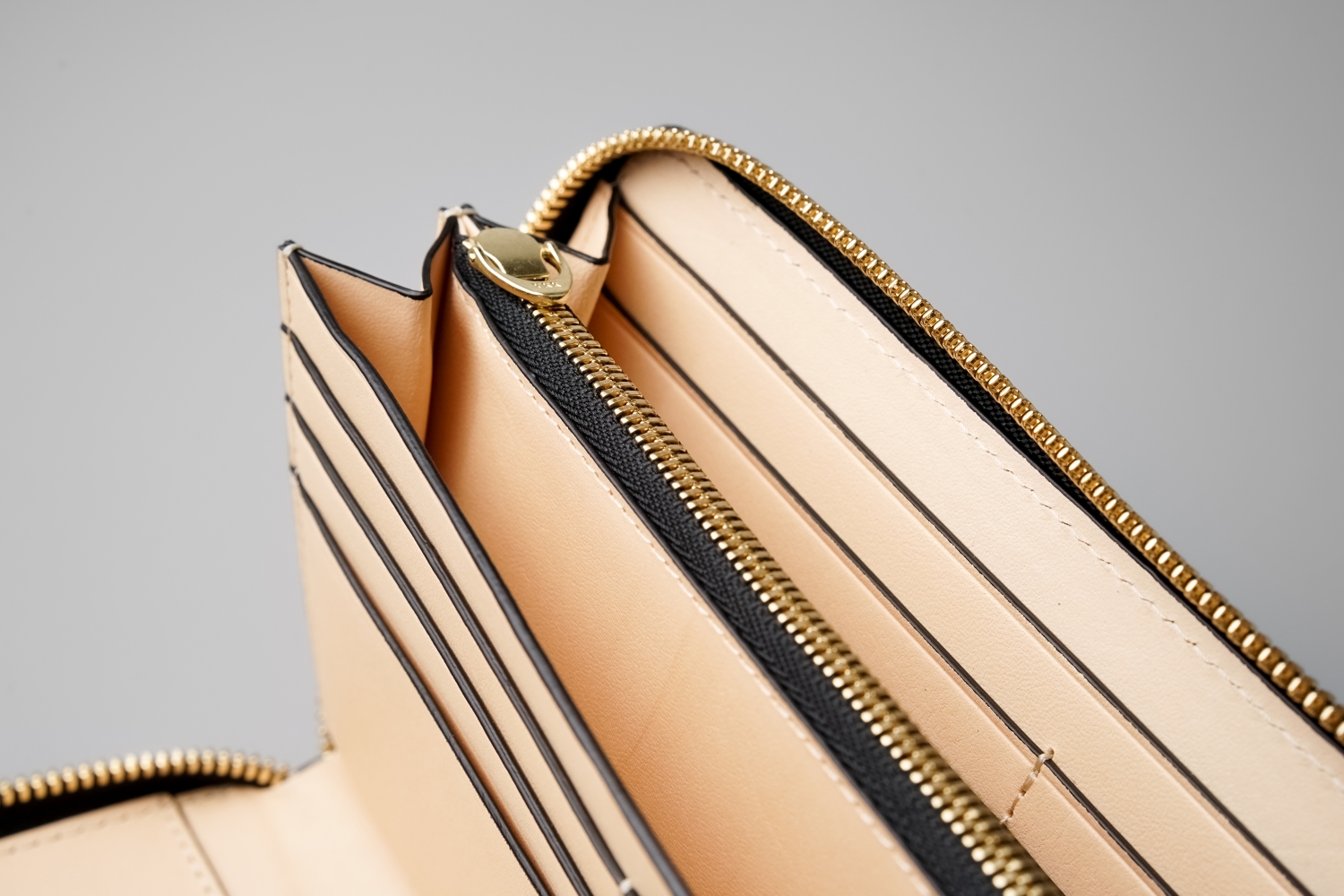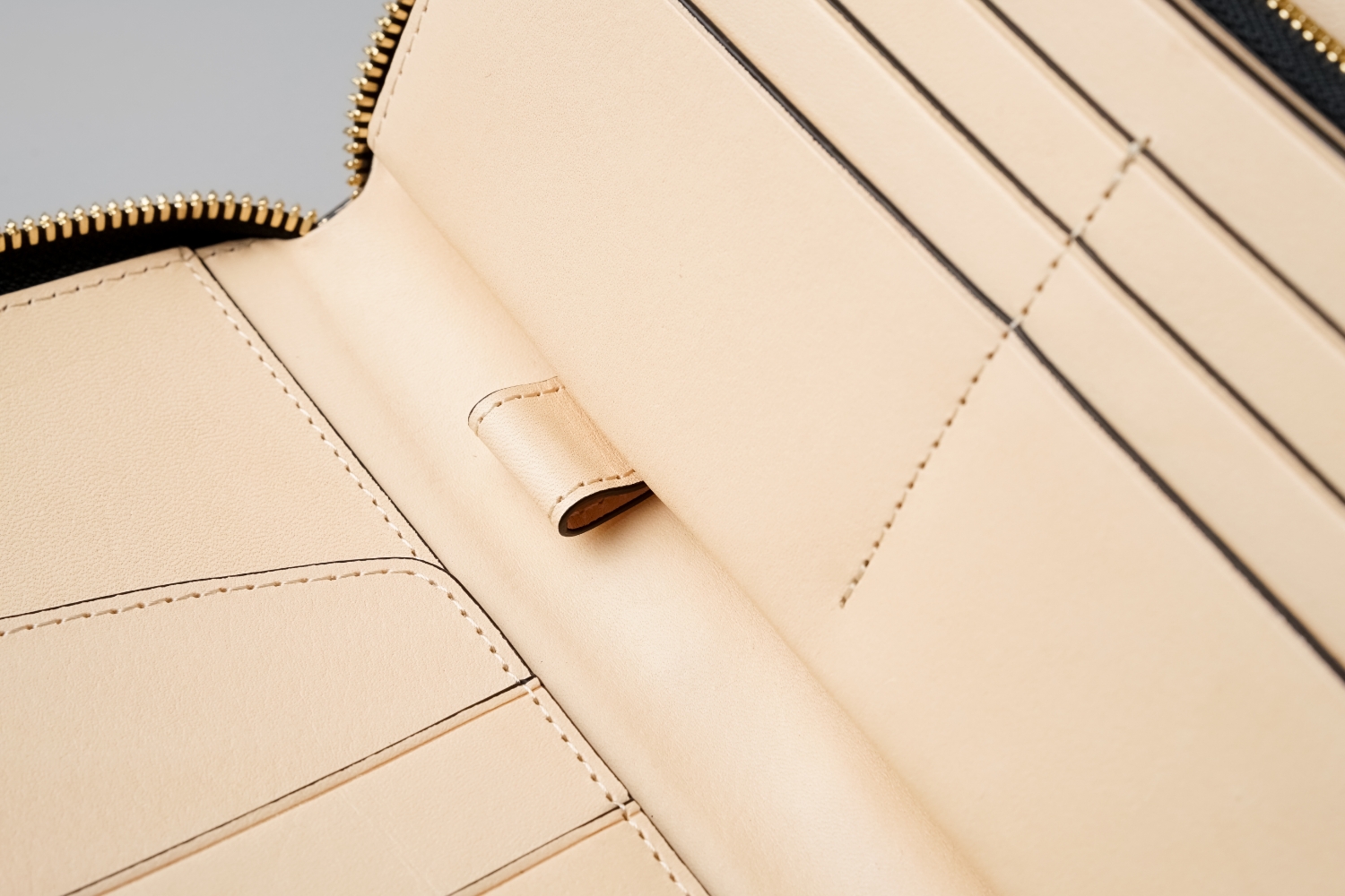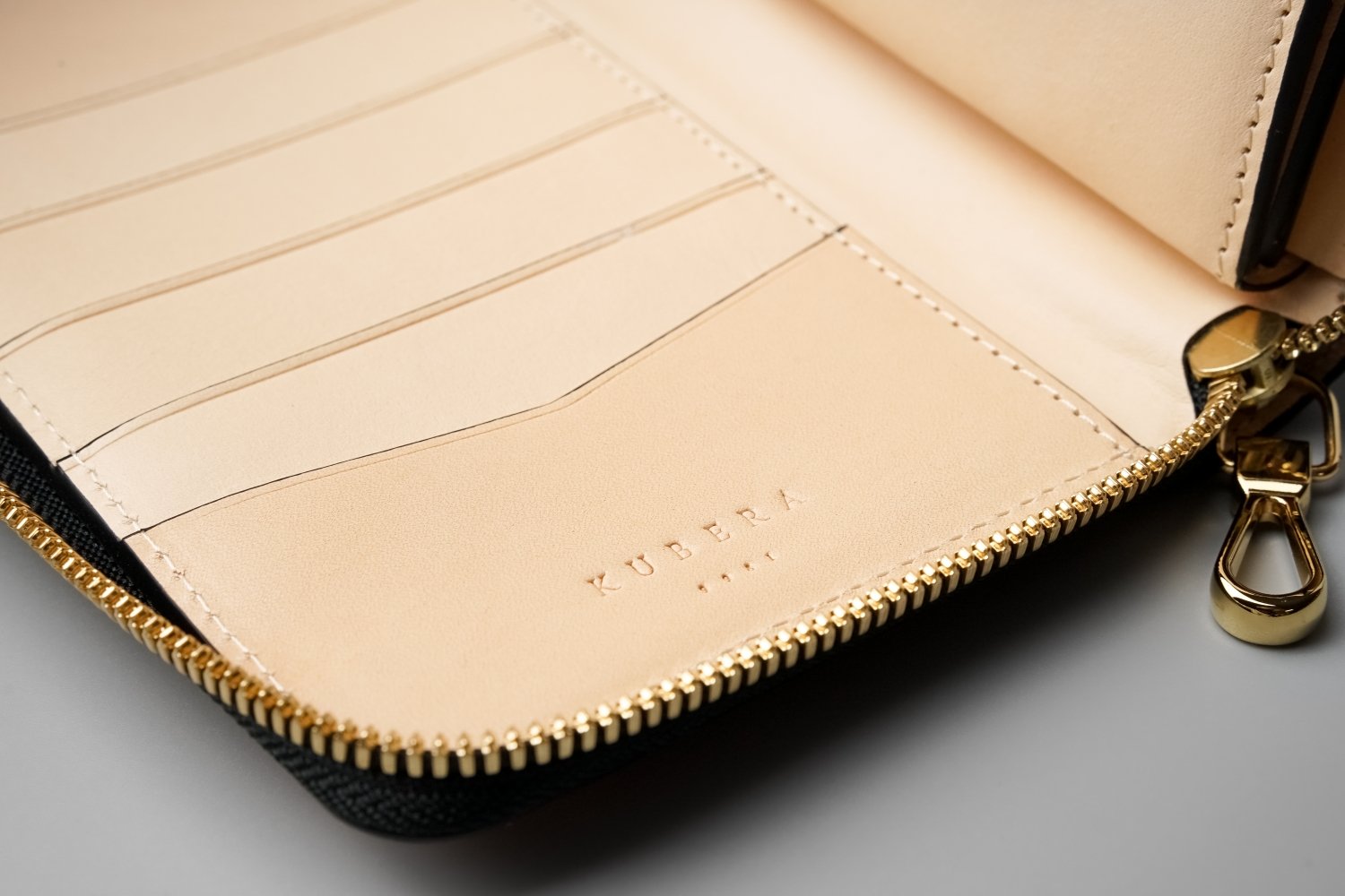 大きく開くフルオープン仕様に蛇腹式の札入れを装備した機能的な内装は、視認性が良く出し入れがしやすい設計。紙幣や領収書などの仕分けができ、17枚のカードを収納できます。滑らかさと耐久性が求められる小銭入れのファスナーにはYKK最高級の「エクセラ®」を採用。