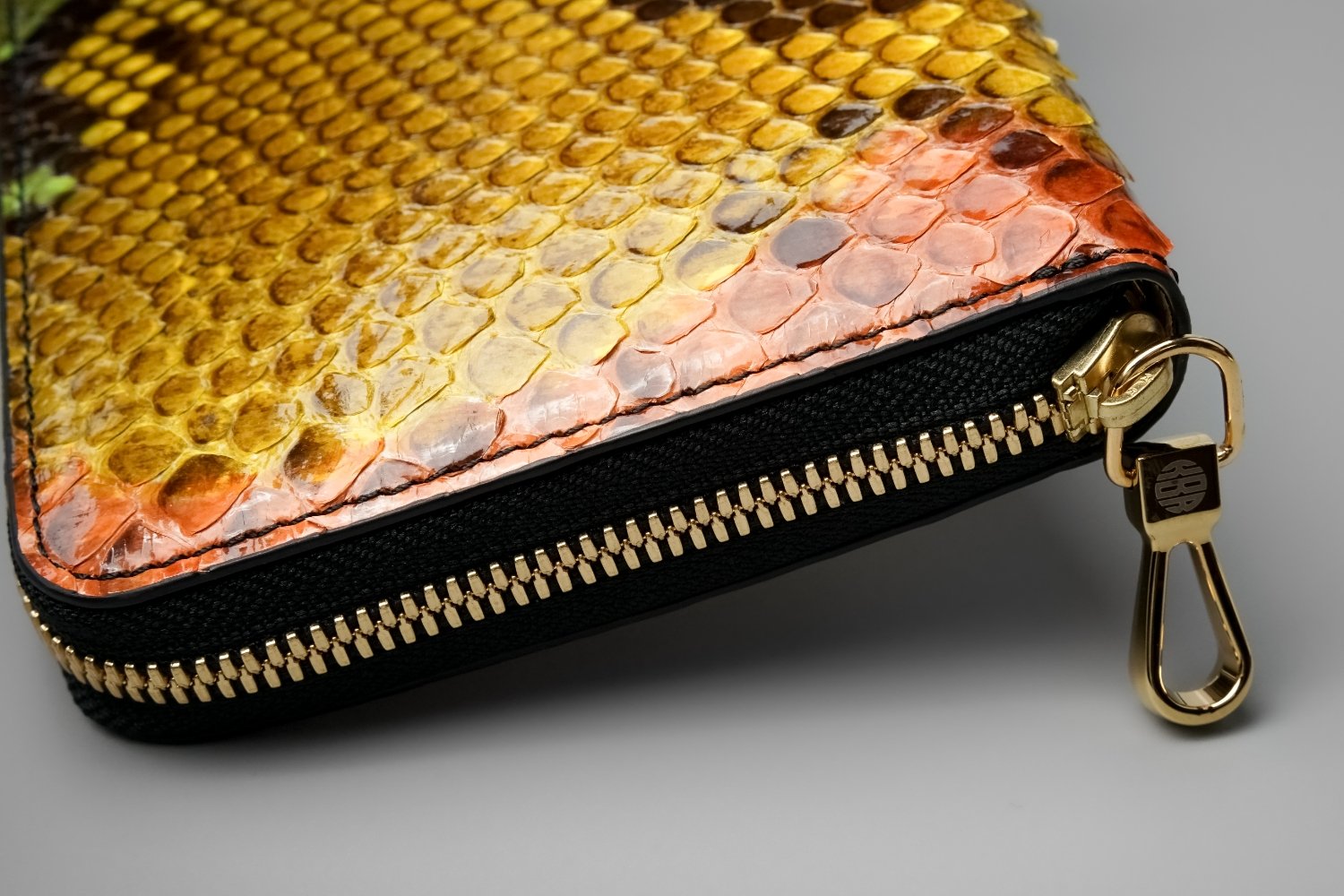 職人が一枚一枚、柄に合わせて手染めを施した唯一無二のダイヤモンドパイソン。絵画のように味わい深く、表面にはグレージング加工による美しい光沢を湛えます。鱗は余程強い力を掛けない限り簡単には剥がれず、長く経年変化を愉しみながらお使いいただけます。